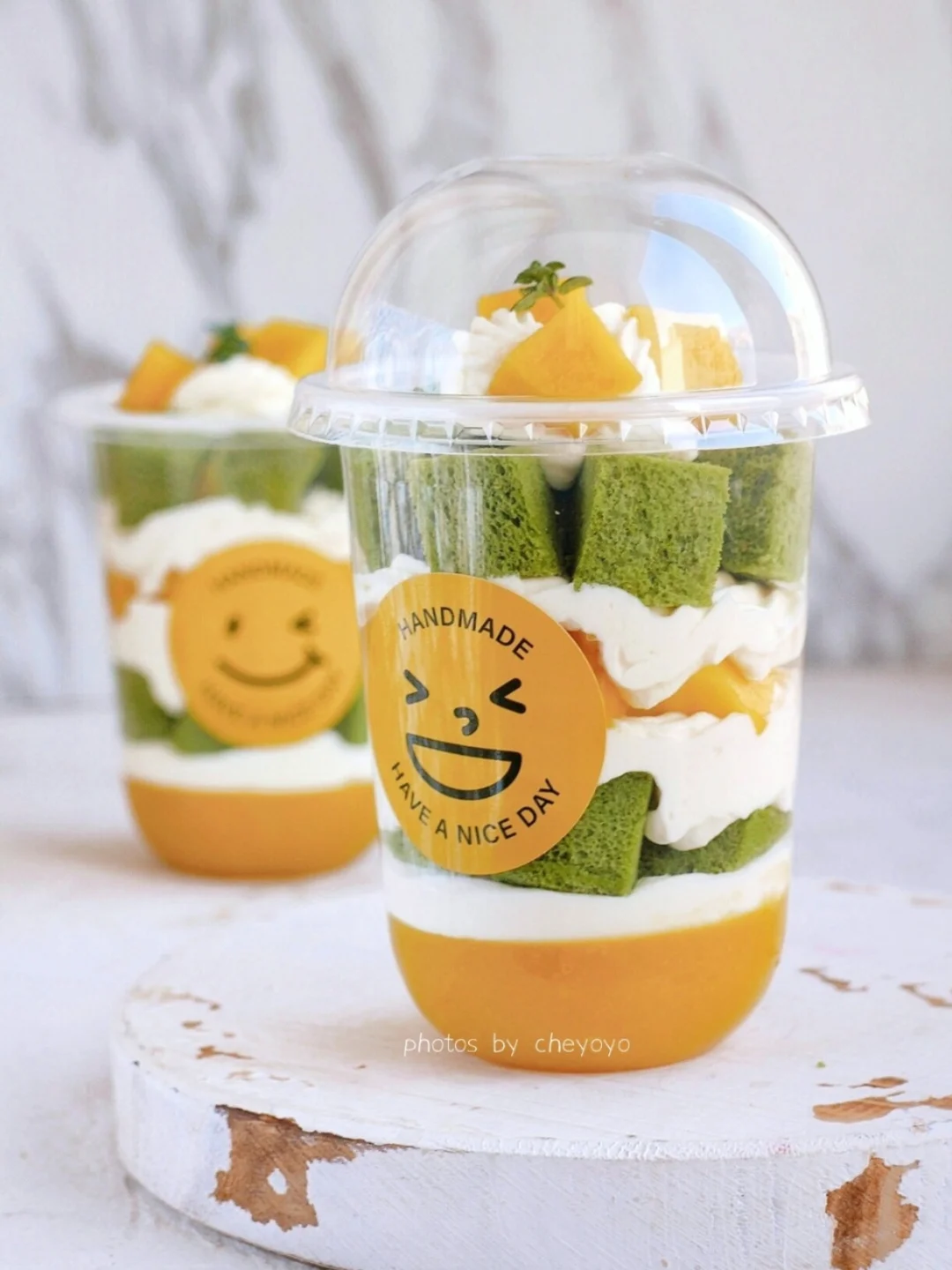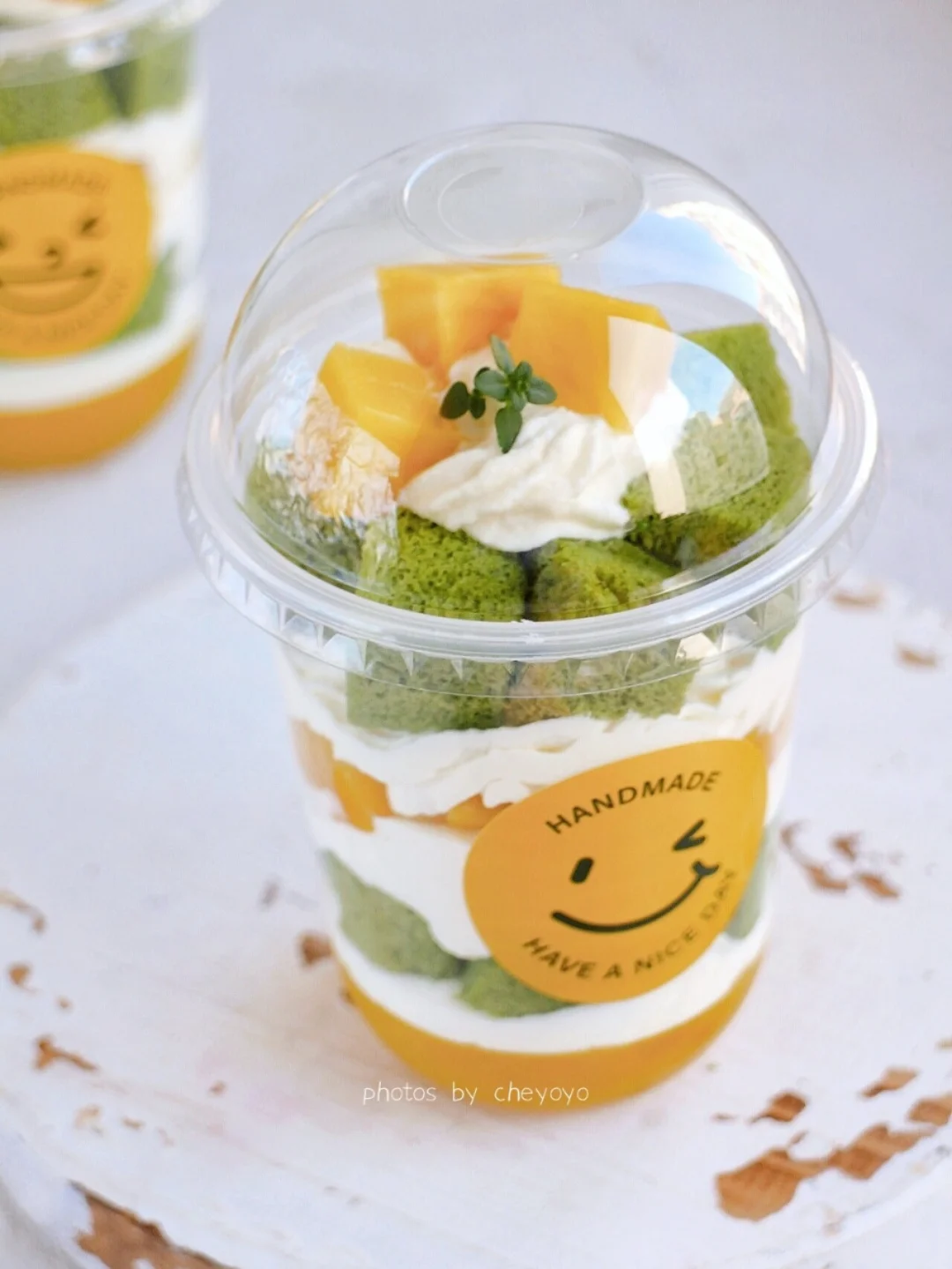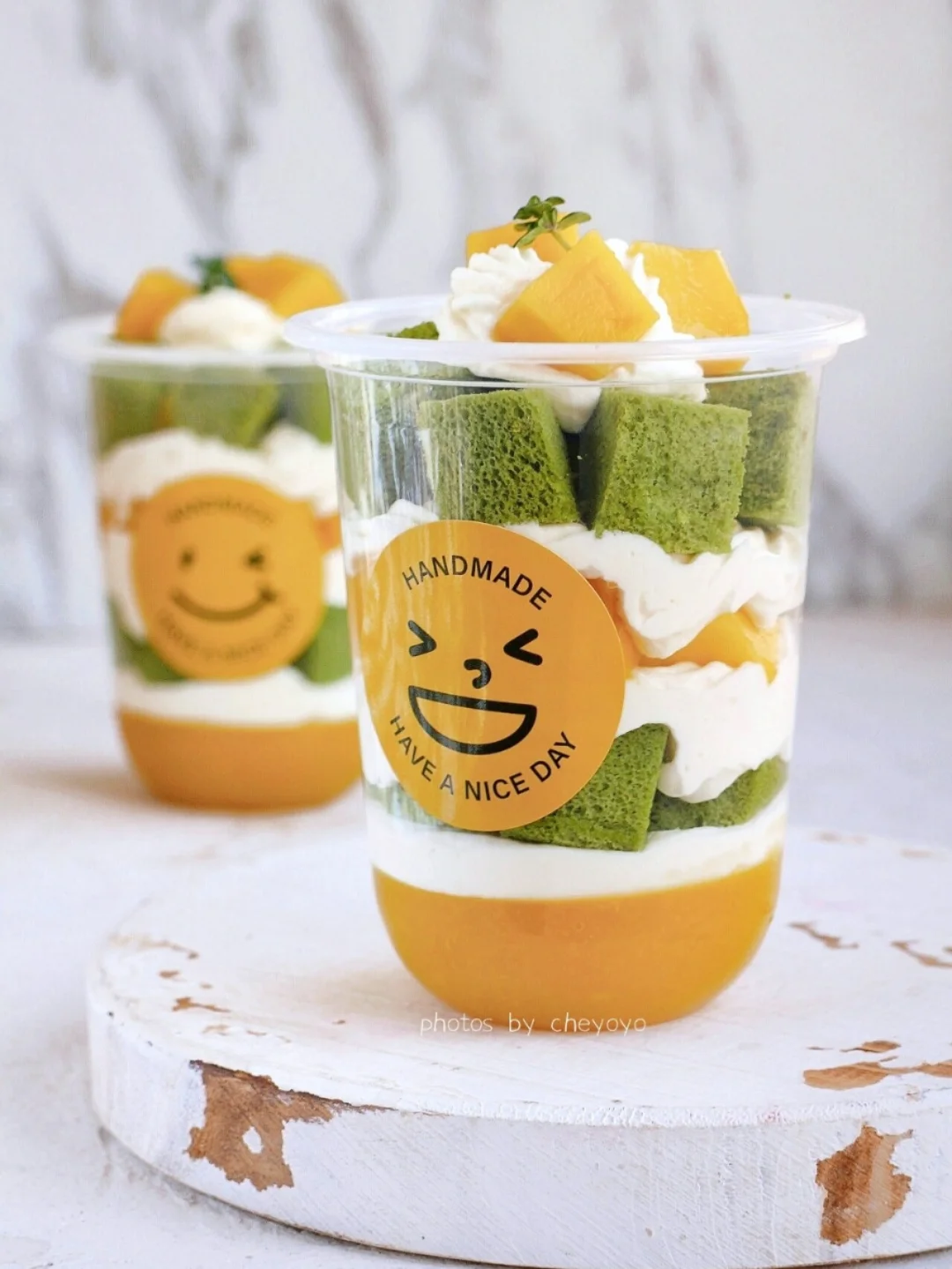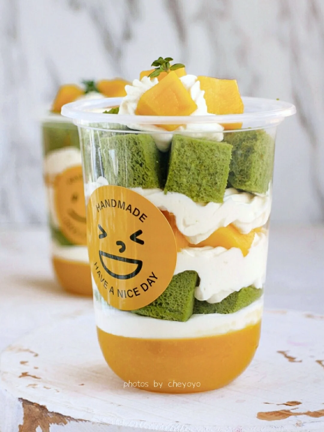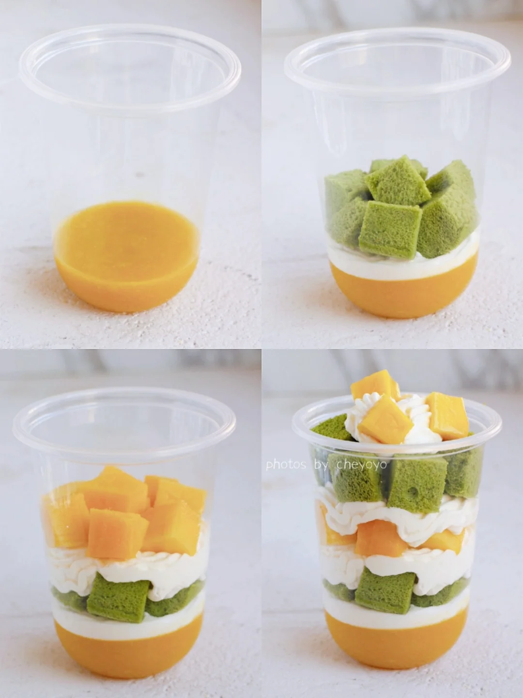 ① 冷藏好的芒果布丁从冰箱取出,依次装入香缇奶油、抹茶戚风、香缇奶油、芒果丁、香缇奶油、抹茶戚风;
