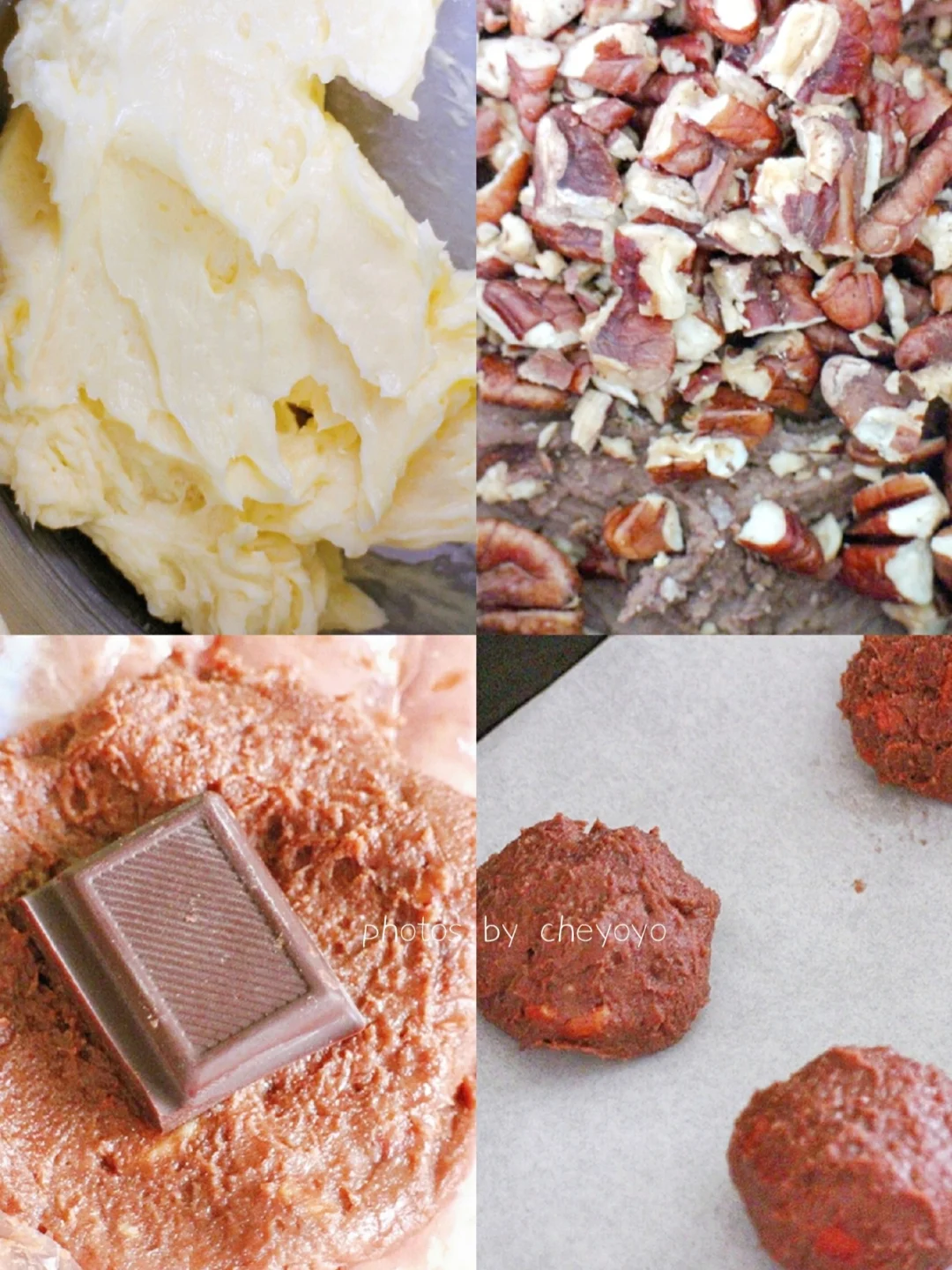 ③ 筛入低粉、可可粉、玉米淀粉、海盐翻拌均匀,放入碧根果碎搅拌均匀,整理成团;