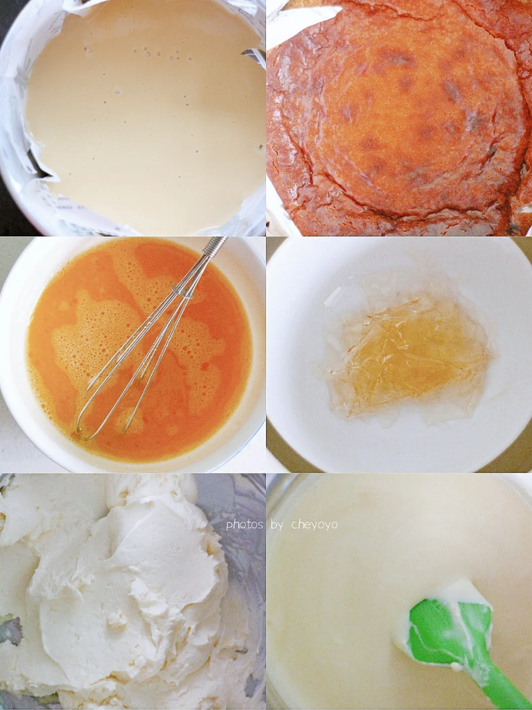 ⑤ 淡奶油打至6分发,与奶酪糊混合拌匀,倒在晾凉的巴斯克上,放入冰箱冷藏4小时左右;