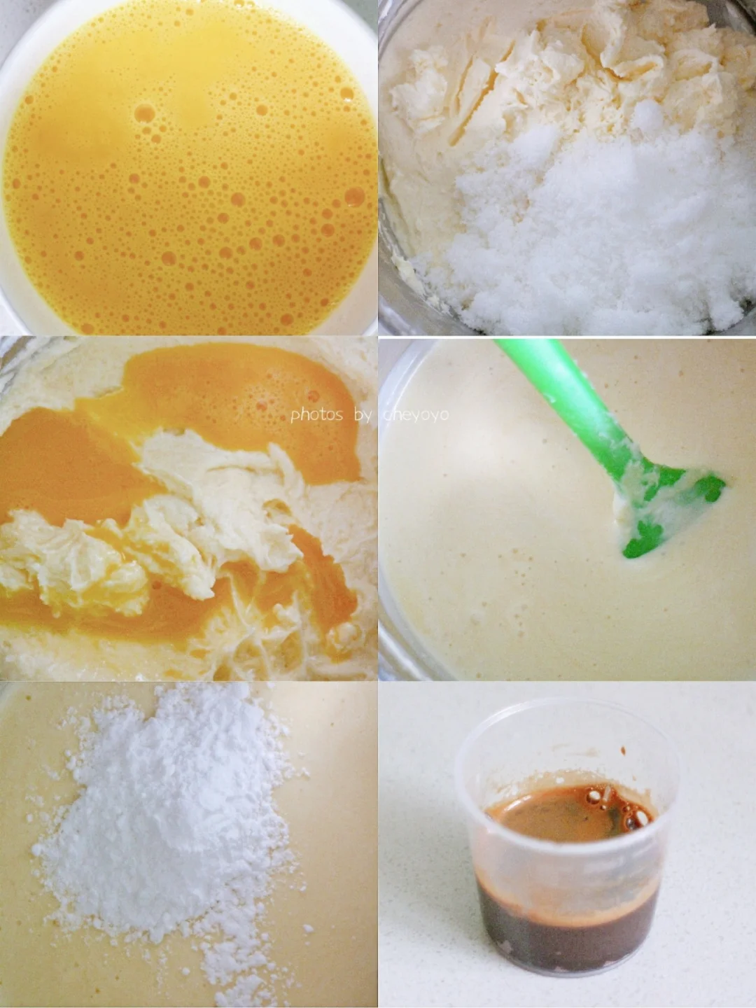 ① 全蛋和蛋黄搅拌均匀,速溶咖啡和清水混合搅拌均匀;