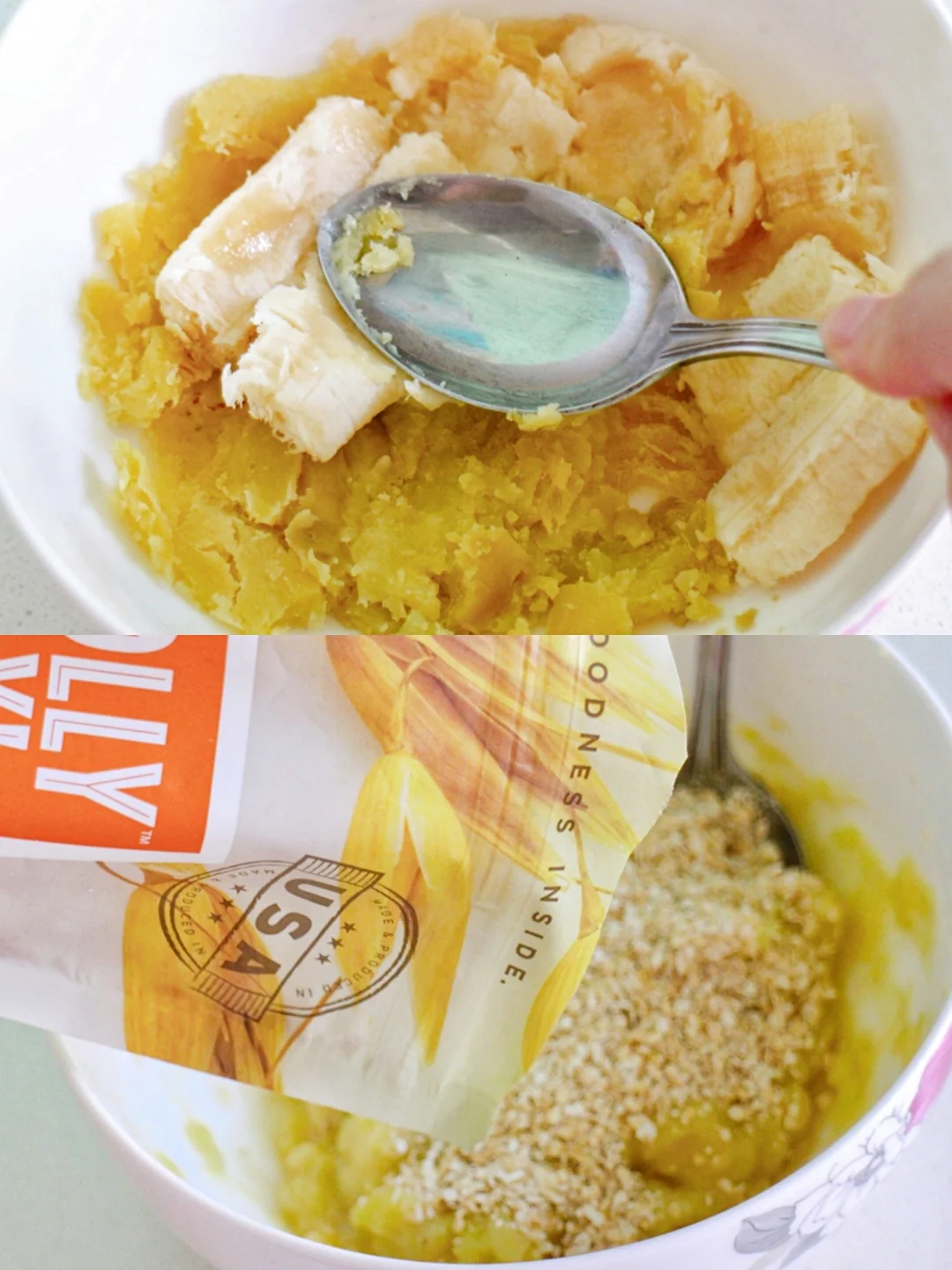 这是一个减肥期也可以放心吃的小甜品!将地瓜、香蕉和燕麦混合代替黄油塔皮,不需要额外加糖,香蕉和地瓜本身的甜度已足够。倒入酸奶,摆上无花果,大大的一口简直太满足[派对R][派对R] - 🔹食材🔹 好哩燕麦麸皮、香蕉、地瓜、酸奶、奶粉、无花果、蓝莓 - 🔹做法🔹 ① 香蕉和地瓜捣碎,加入少许奶粉搅匀; ② 倒入燕麦麸皮拌匀,放入模具中压平,入180度烤箱烘烤15分钟左右; ③ 香蕉切薄片,铺在冷却后的燕麦塔底部; ④ 倒入酸奶,摆上无花果和蓝莓就可以了[害羞R]