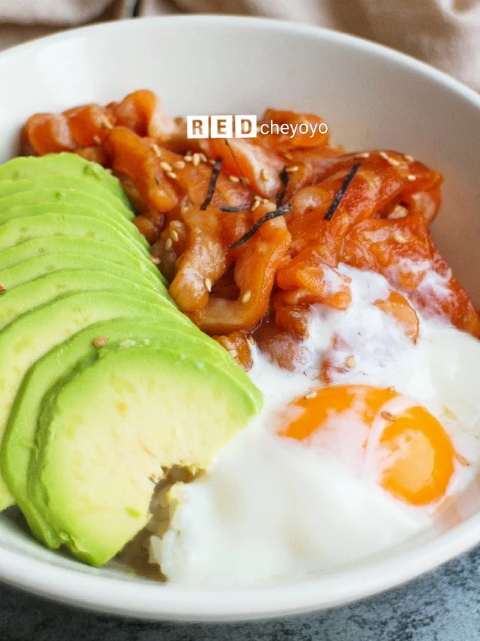 不亲自尝试你永远不知道它有多美味! 好吃到流泪恐怕就是如此吧~ 材料:三文鱼、牛油果、米饭、鸡蛋、生抽 ①三文鱼切薄片,倒入生抽腌制几分钟; ②牛油果切片; ③在1L沸水中倒入300g凉水,然后迅速将鸡蛋放入焖7分钟,取出后捞出打到碗中备用; ④将三文鱼和牛油果铺到米饭上,在挖个坑倒入温泉蛋即可。