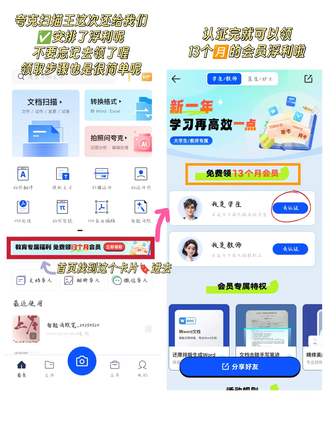 ✅浮利:它这次还给我们安排了学生浮利,别忘记去领喔!大学生可以在夸克扫描王首页的【教育福利】卡片里,认证学生学生身份,立领13个月会员!!!