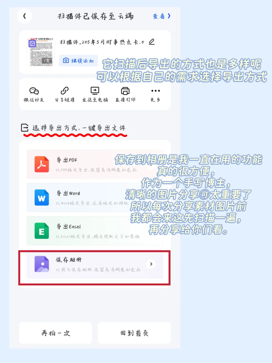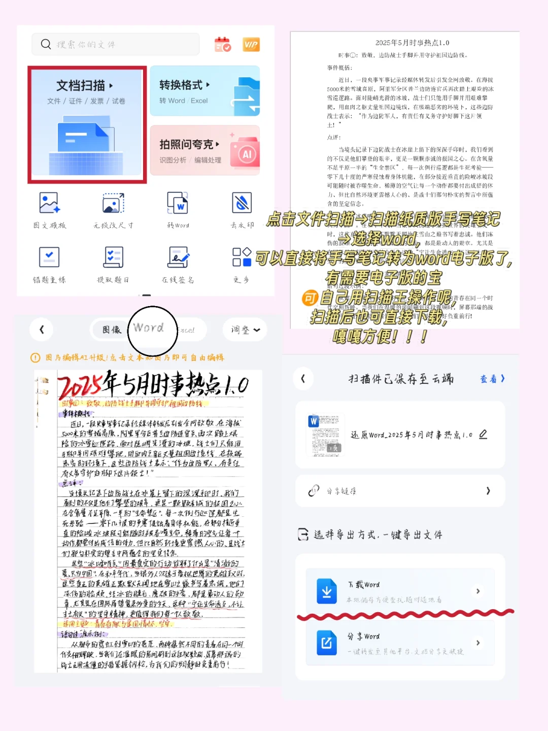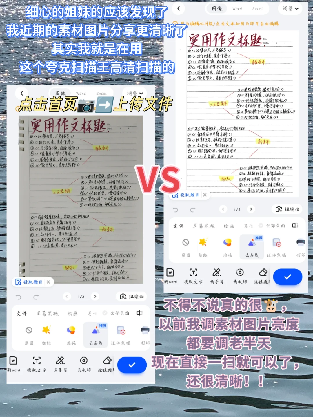 ✅文件扫描:不知道有没有👭发现我最近分享的作文素材的图片都有所不一样了,更清晰了,没错,自从我发现了这个宝藏艾皮皮,我每次同你们分享作文素材的时候都会用扫描王先扫一遍手写笔记,一下就变成高清图片了,节省了我调图片亮度的时间,操作也是很简单呢(首页功能“文件扫描”→对着手写笔记拍照),它还🉑选择word形式下载导出哦,非常方便。