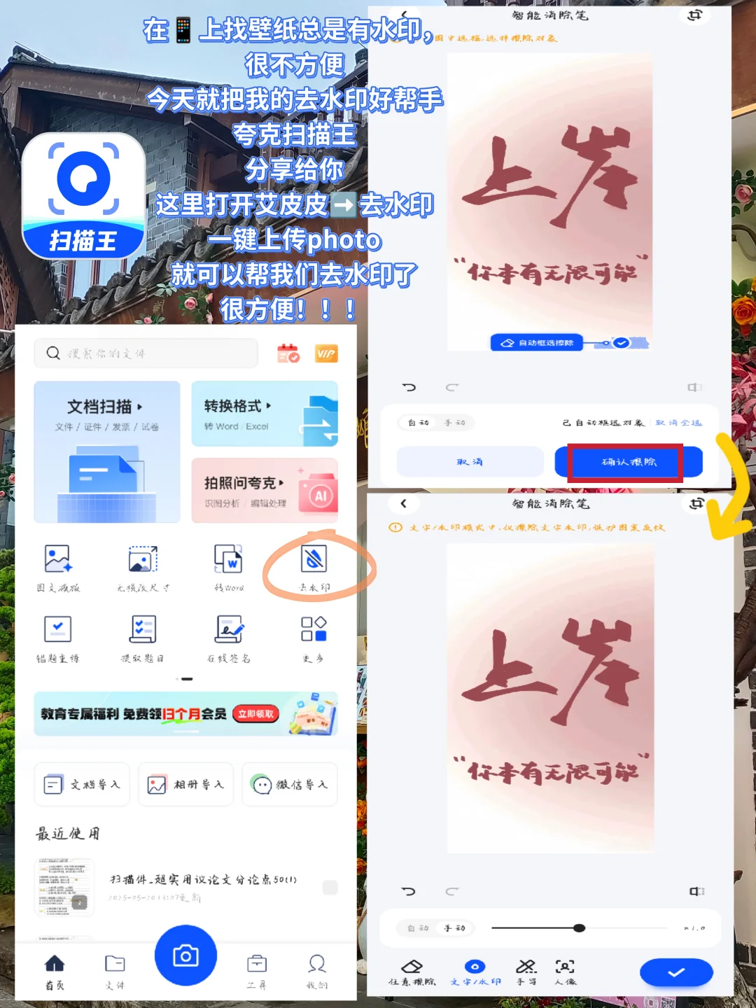 在保存美句图片时,右下角有水印,想做壁纸总会影响观感💭还好我有去水印神器!一起分享给👭们🔎夸克扫描王(这是老盆友了,使用了一段时间,真感觉很不错)