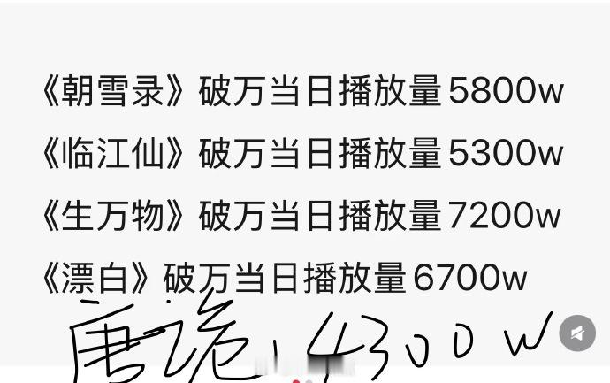 不是说非流量的剧播放量最干吗?干成这样破万是不是太夸张了 现在破万最有含金量的🥝也没有了唐诡3破万播放量云合4300+,目前处于横盘中,保持下去集均3000w都会有点危了百指云合出来跟热度一对比,这破万又能好看到哪儿去?何苦两边不讨好….前面临江仙破万被🐎惨了,朝雪录也在质疑声里一路超漂白,现在唐诡3又搞这么着急,唐诡3破万日云合才四千多,创下桃破万日单日云合最低……