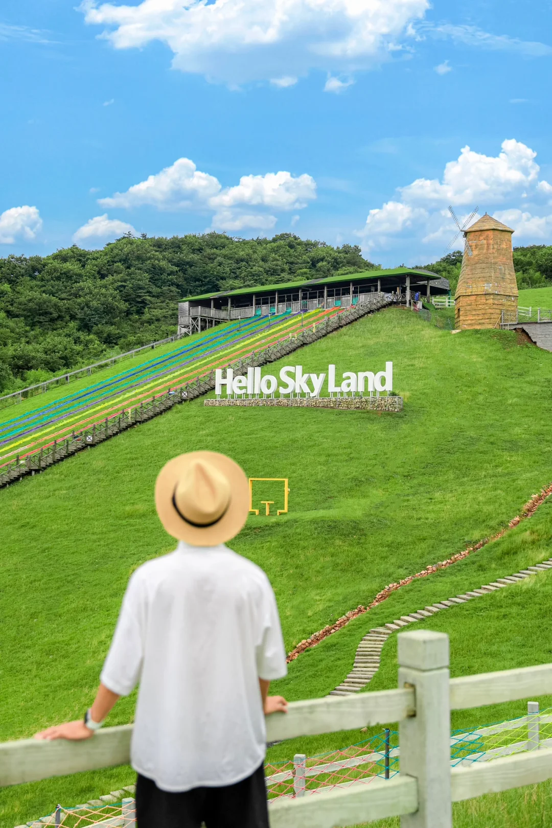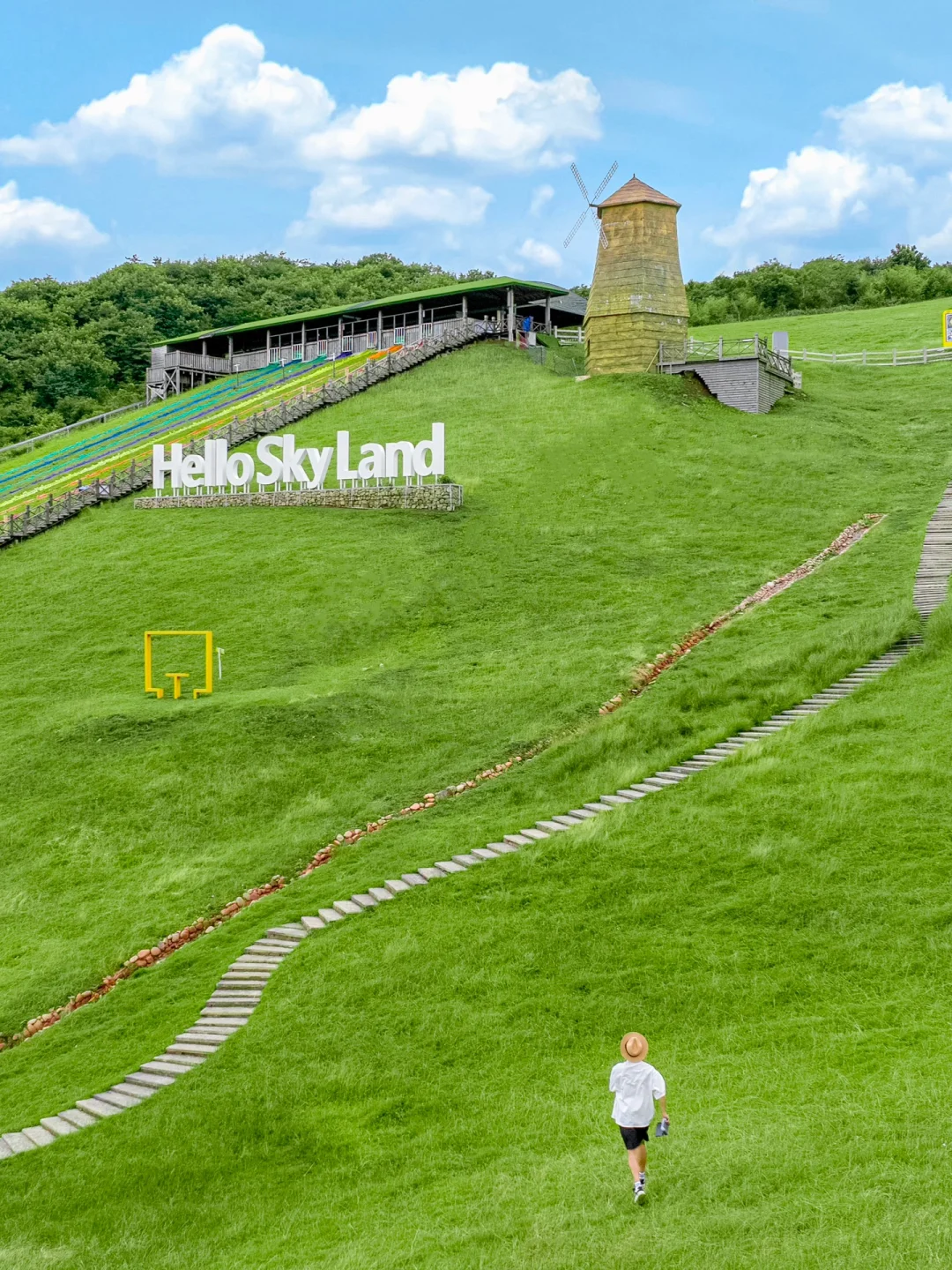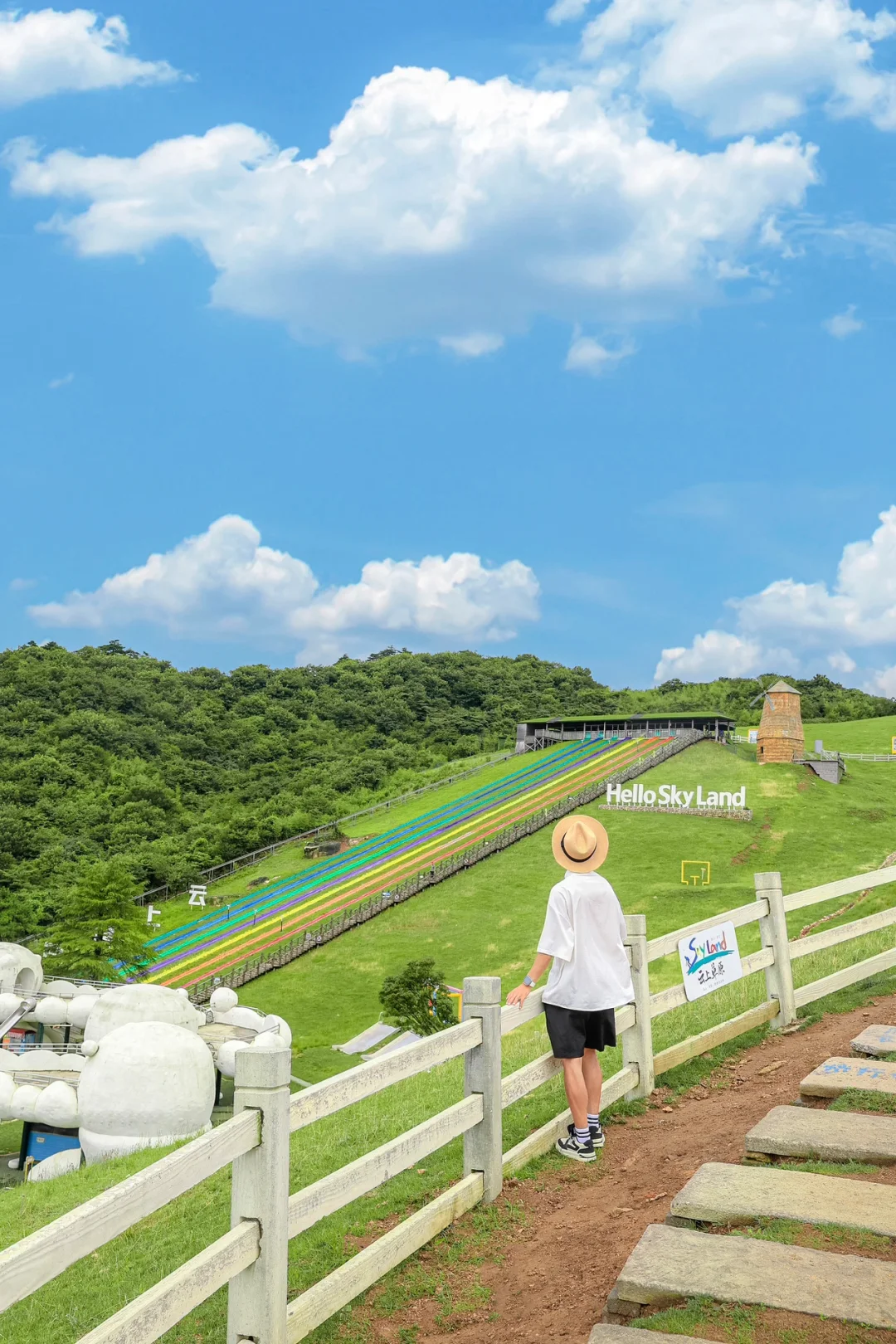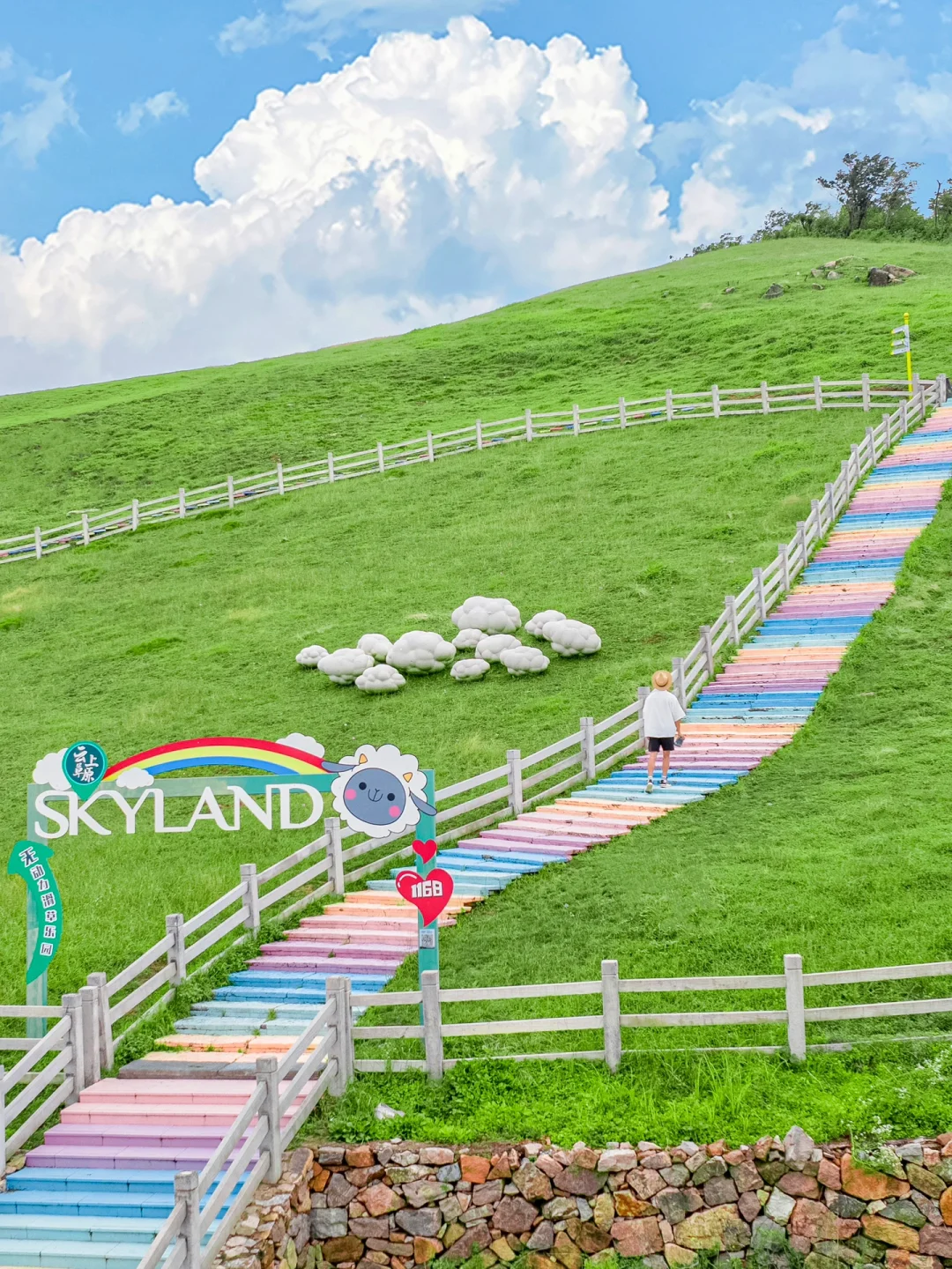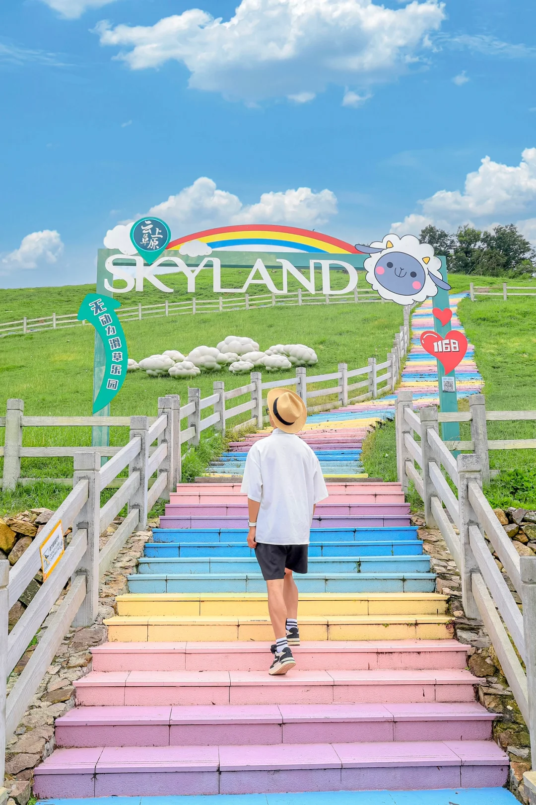 1️⃣索道下来后租电瓶车的彩虹石梯:彩虹🌈石梯加上绿色草原🌿和蓝天白云☁️宛如走进宫崎骏动画世界