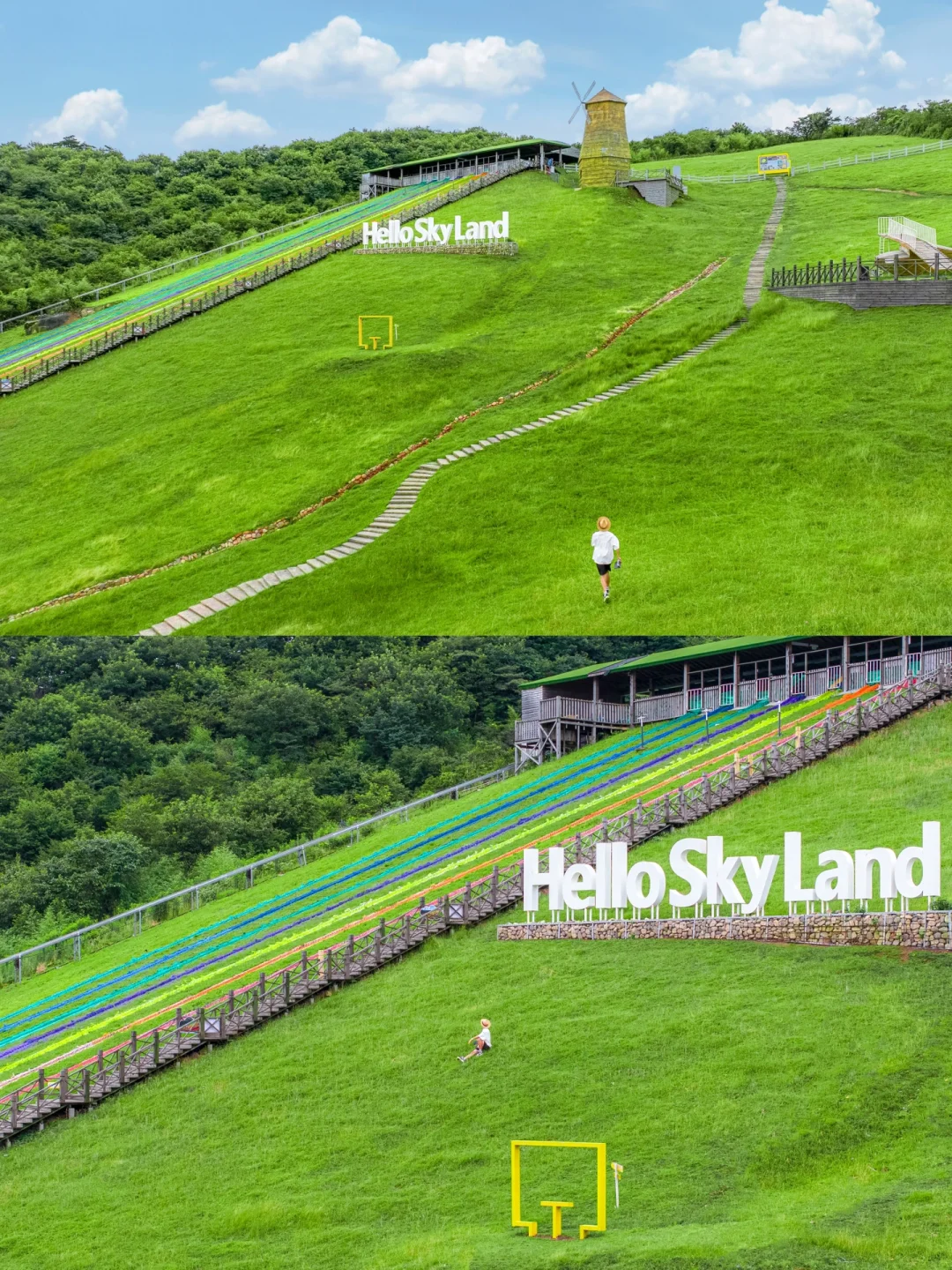 2️⃣彩虹滑草附近:这里是草原🌿面积蕞大也是蕞出片的地方,山坡上洗手间🚻前面的护栏往下拍📷也很好看