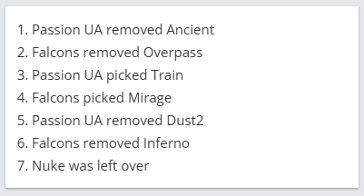 虎扑11月13日讯BLAST香港小组赛胜者组,Falcons对阵PassionUA地图BP: