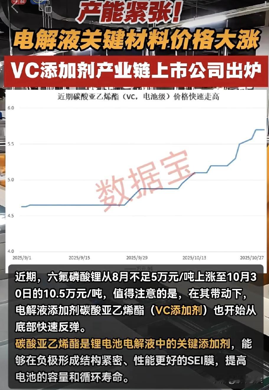 今天爆发? 🌿涨!涨!涨! 一、六氟磷酸锂,价格上演“疯狂”走势,一月内飙涨超50%,从6万元/吨冲高至13万元/吨!涨价概念导致个股疯涨,储能需求的爆发性增长,导致市场出现严重供需错配,库存已降至极低水平。现在也涨了很多了,风险已经非常高了。 二、电解液添加剂(碳酸亚乙烯酯)近期价格显著上涨。11月12日,VC报价10-12万元/吨,相比上一日跳涨超4万元,幅度超50%,从底部4.5万元已上涨达150%。从个股来看,已经涨了好几天了。今天消息曝光出来。是接盘侠还是继续涨呢? 新能源“液态黄金争夺战,电解液的狂欢事情是这样的”还能持续多久?今天是集体高潮了,成为市场最靓的仔!追还是不追呢?还是多看少动!
