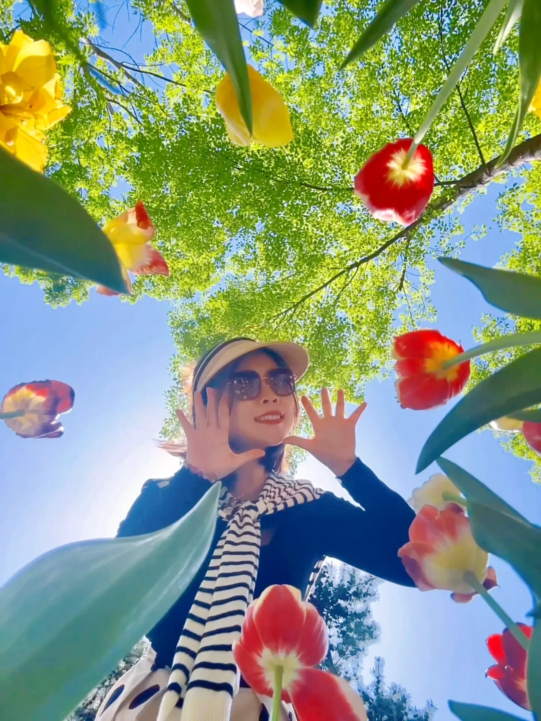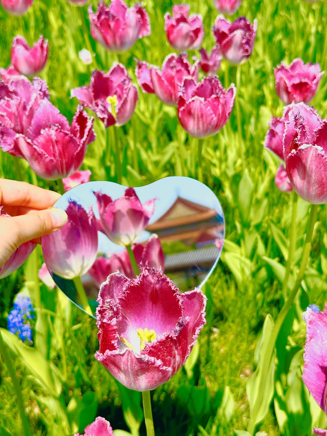🌷尝试低机位拍摄,将手机放进花丛仰拍,get蓝天琉璃瓦与发光郁金香同框