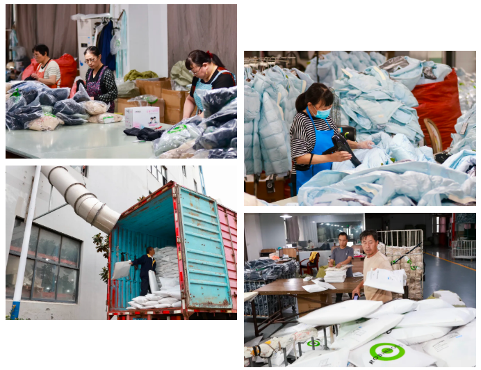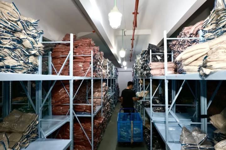 不远处的大仓库里,工人们早已开始这一天的忙碌。这里常年备着百万件现货,清一色的90白鸭绒轻薄基础款羽绒服。眼下,正值一年中最繁忙的季节,室外气温仅10℃出头,室内大家却穿着短袖,干得热火朝天。