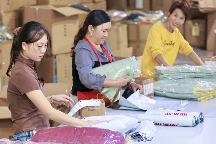傍晚6点半,平湖·中国服装城依然灯火通明,客商往来不绝。仓库里,工人们正在打包当天最后几批订单。这些填充着90白鸭绒的羽绒服,将被发往全国各地乃至全球,发往每一个需要温暖的角落。