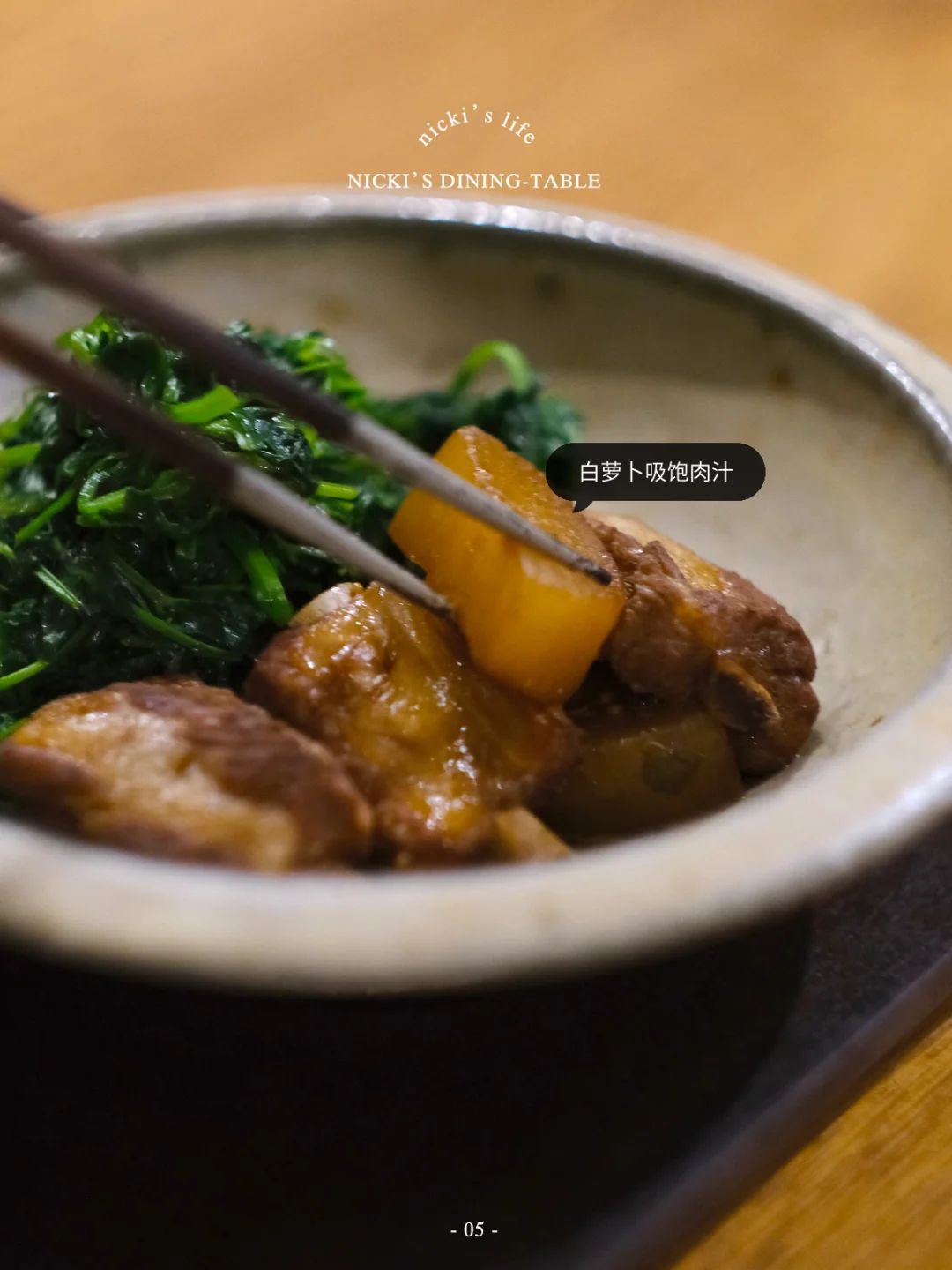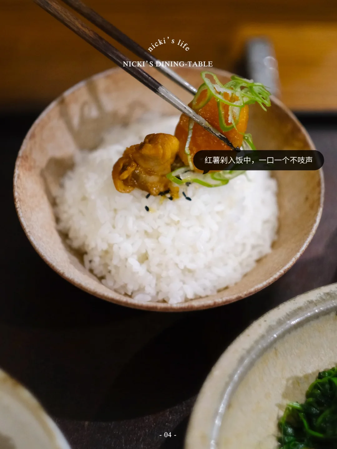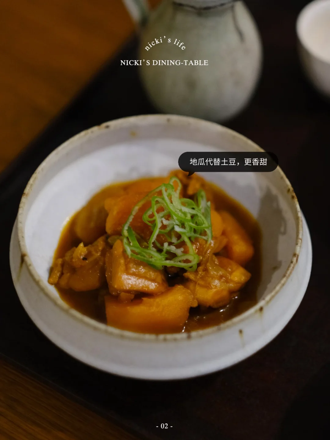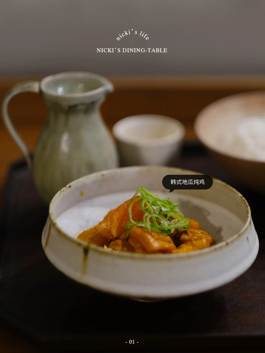 自己做饭自己吃,不需要迁就别人的口味。今天想吃得清淡还是重口,全凭自己当下心情。 - 🔅今日份c位菜谱:韩式地瓜炖鸡🔅 ·鸡腿肉切块,加入韩式辣酱、辣椒粉、蒜末、糖、生抽抓匀腌制2小时。 ·洋葱切块,地瓜去皮切块。 ·锅中倒油,放入鸡块煎至变色金黄后加入洋葱,炒至洋葱透明后,加入高汤(没有的话加水),倒入地瓜,盖上锅盖焖煮20分钟即可出锅。 🥗 菜单: -韩式地瓜炖鸡 -白萝卜炖排骨 -清炒豌豆尖