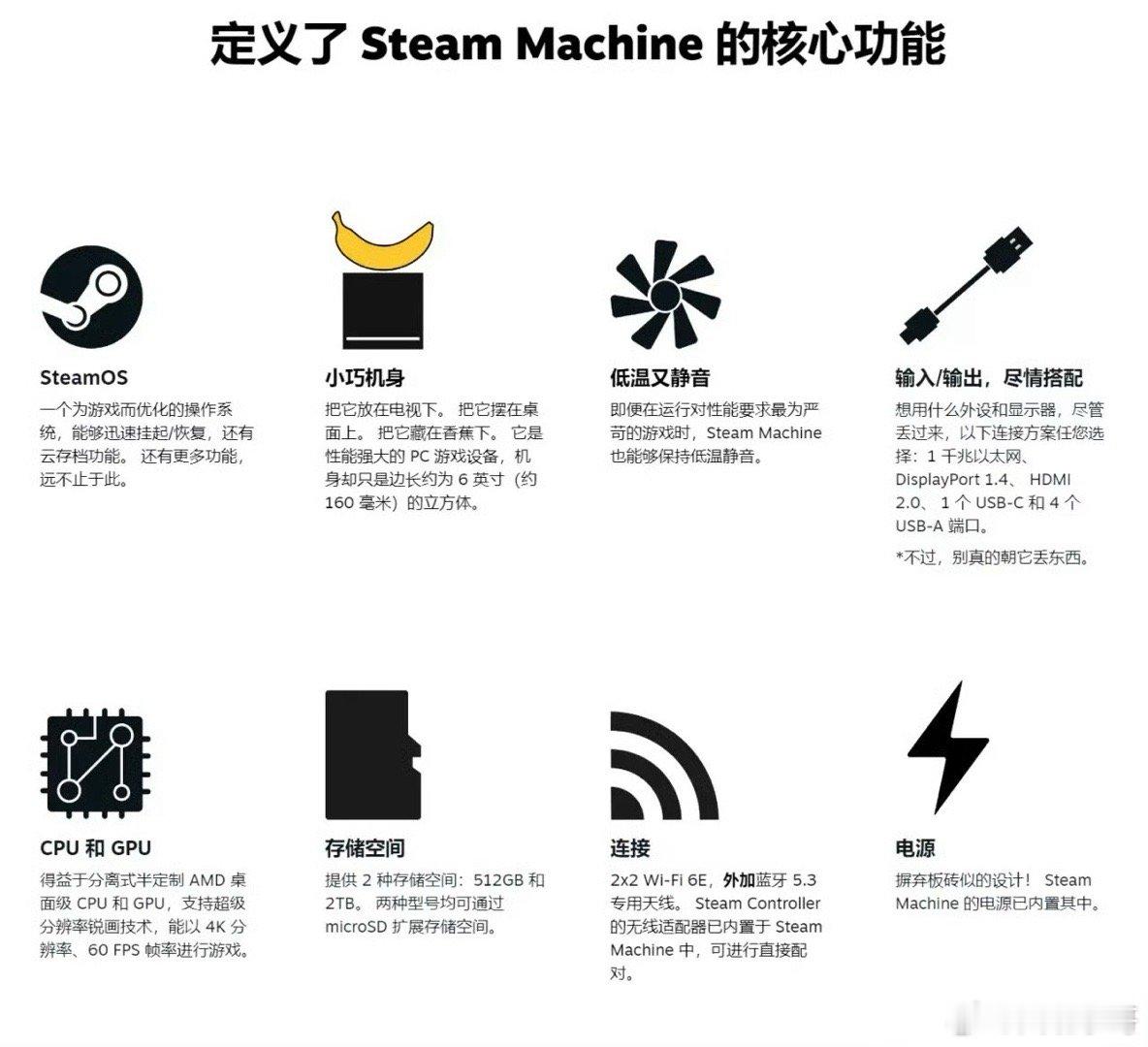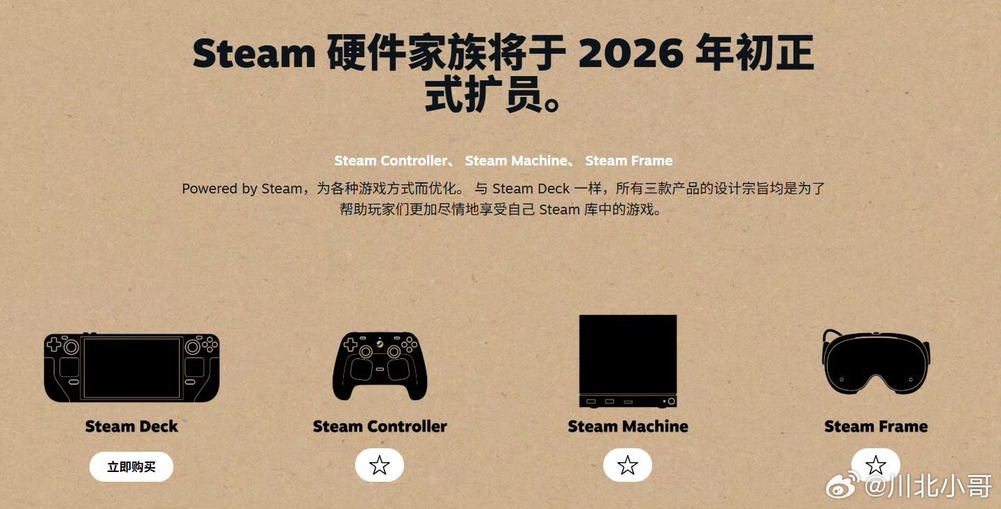 Steam主机设备震撼公开!主机、VR设备、手柄三件套将于2026年强势来袭,为玩家打造沉浸式游戏宇宙。新一代Steam Machine性能是Steam Deck的六倍,轻松实现4K 60帧丝滑游戏体验,512GB、2TB双版本+MicroSD卡扩展,存储自由任你畅享。Steam Frame VR头戴设备支持整个Steam游戏库,VR与传统PC游戏通吃,搭配专用运动控制器或新款Steam Controller,操控感拉满。新版手柄传承双触控板经典设计,革新布局更顺手。无论是追求极致画质的主机玩家,还是热衷沉浸交互的VR爱好者,这套Steam全家桶都将带你开启游戏新世代,2026年,准备好迎接游戏体验的全面升级!