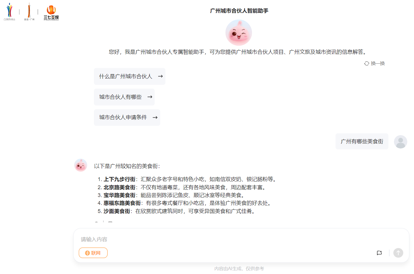 早在10月底,三七互娱自研的广州城市合伙人智能助手(下称“智能助手”)就已上线,覆盖文旅出行、城市活动等全场景咨询,并同步接入全运等服务功能,整合赛事日程、场馆分布等信息,支持市民与游客“秒级”查询。三七互娱方面表示,该功能旨在效缓解大型赛事期间的咨询压力,为赛事顺利举办提供智能化信息保障。