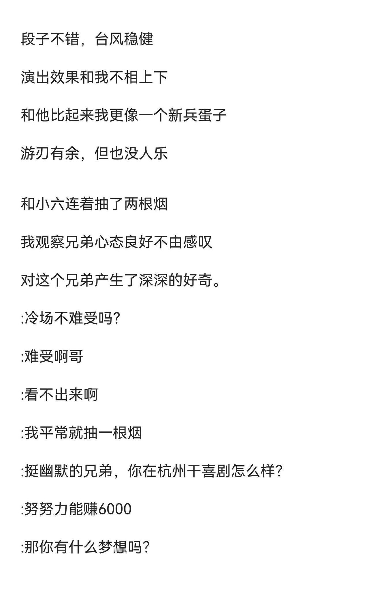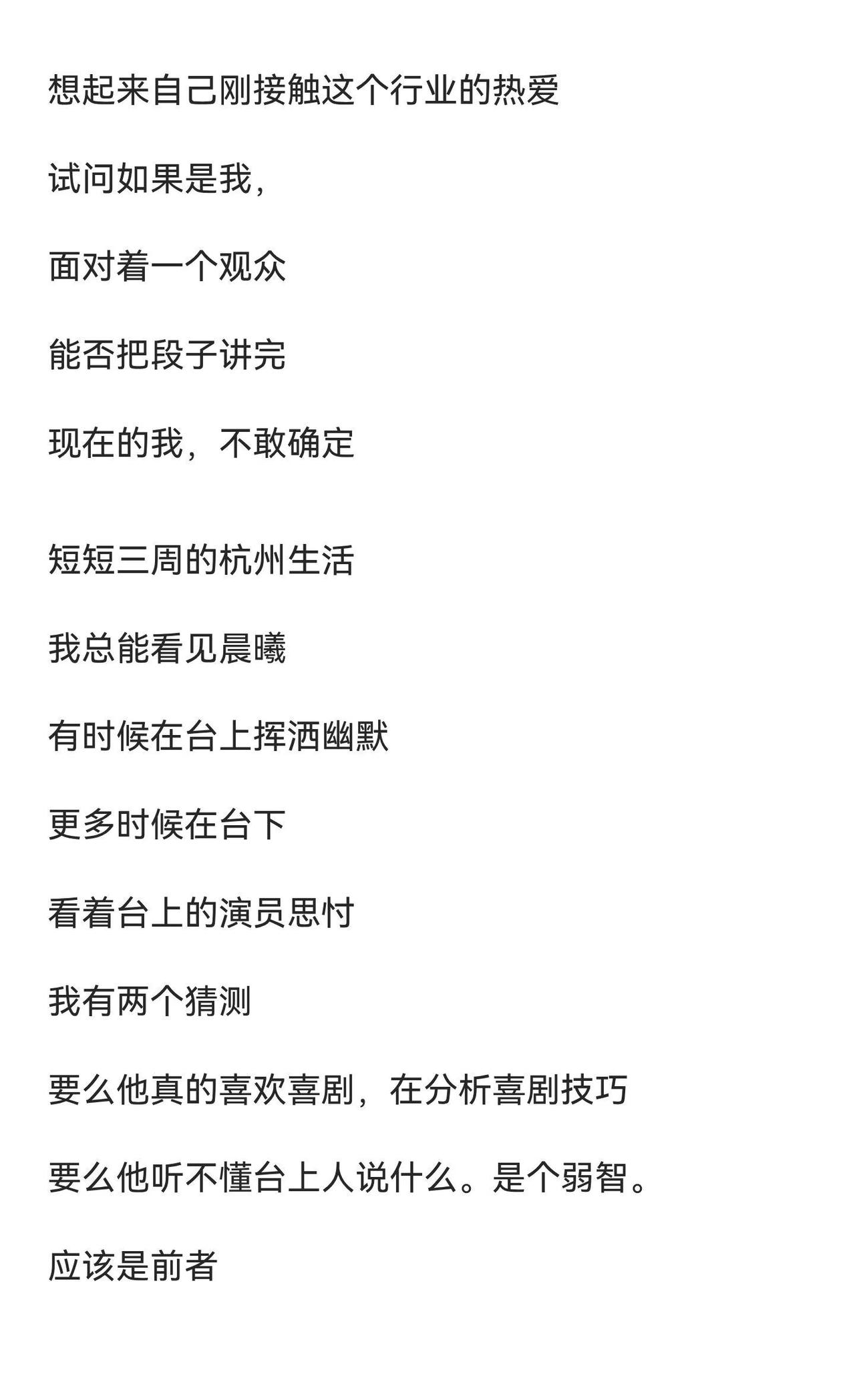 杭州城记 在杭州的三周,我见证了晨曦、小六等喜剧人的努力与坚持,从开放麦到工地,他们用幽默面对生活。杭州的喜剧氛围让我感受到行业的热爱与尊重,也让我思考如何在舞台上释放自我。 AI创造!