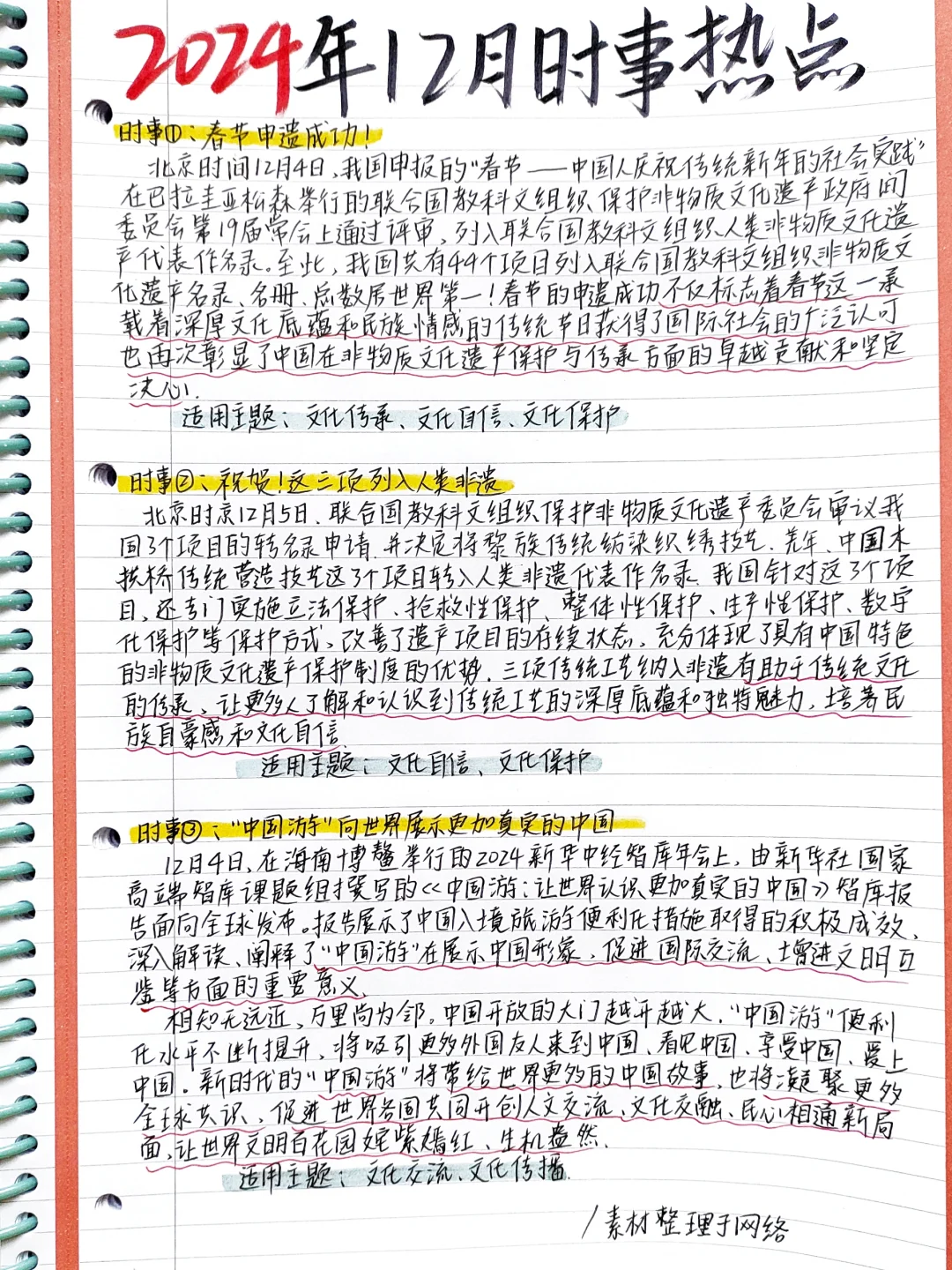 🥣热乎滴12月时事热点整理出来啦 ⛰时事①:春节申遗成功! ⛰时事②:祝贺!这三项列入人类非遗 ⛰时事③:“中国游”向世界展示更加真实的中国 ✅素材整理于网络 PS: (最近的天气降温的有点厉害,大家在努力学习的同时,也要注意保温喔🌷🌷) 猜猜图三我在看啥节目 (无奖竞猜!嘿嘿~👻) 💬句子分享: 花大量的时间提高自我 如此便无暇去批评别人 足够豁达则少忧虑 精神高贵则不易发怒 内心坚强则无所畏惧 心态开朗则麻烦远离。 —from 《乐观主义者的信条》