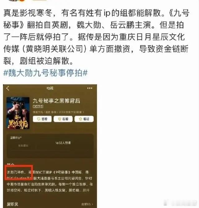 近一年停拍的剧是最多的!赵露思彭冠英的《恋人》停拍,邓为李宛妲的《风月不相关》停拍,吴谨言陈哲远《江山为聘》停拍,李宏毅张艺凡《起落安妥》停拍,魏大勋岳云鹏《九号秘事》停拍,许凯周也的《一瓯春》多次停拍,不管是不是影视寒冬,但是这些组里肯定都有些对项目不太负责任的人。