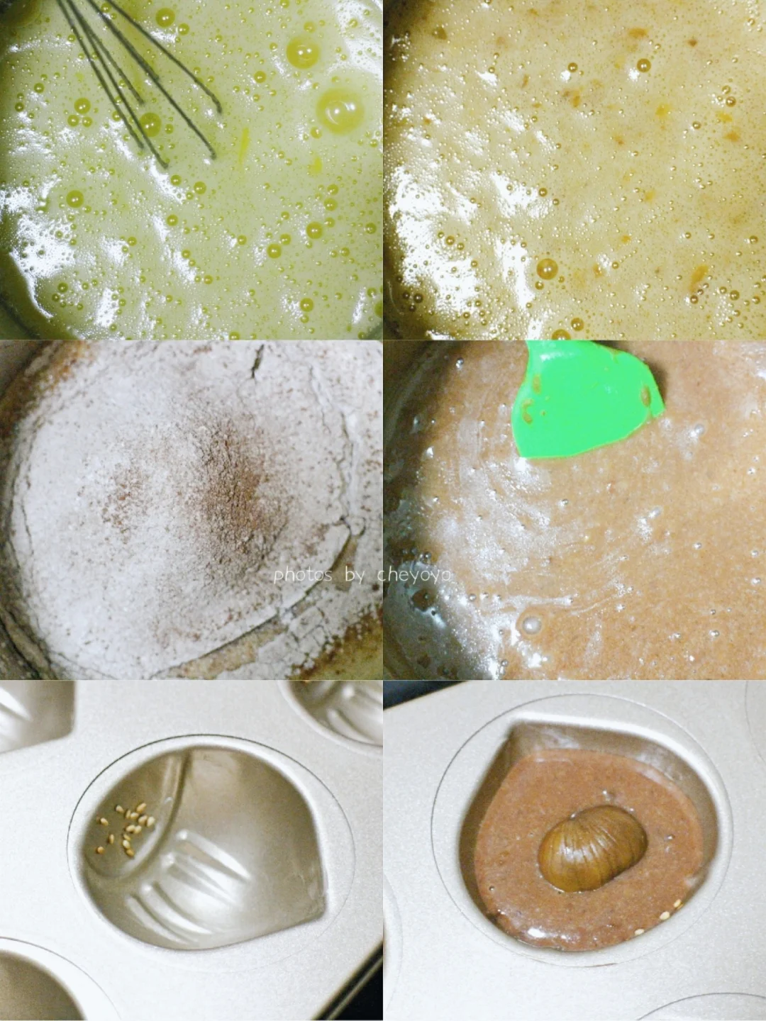 ④ 模具均匀抹上黄油,底部粘上芝麻,挤入面糊,放上栗子仁,再挤入面糊盖住栗子仁;