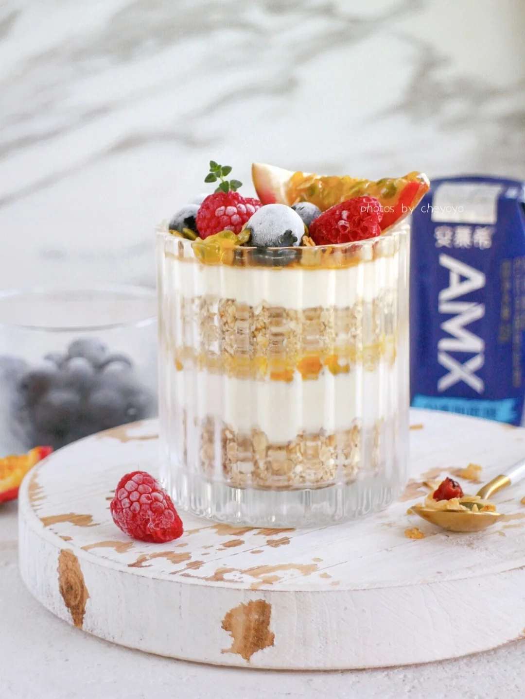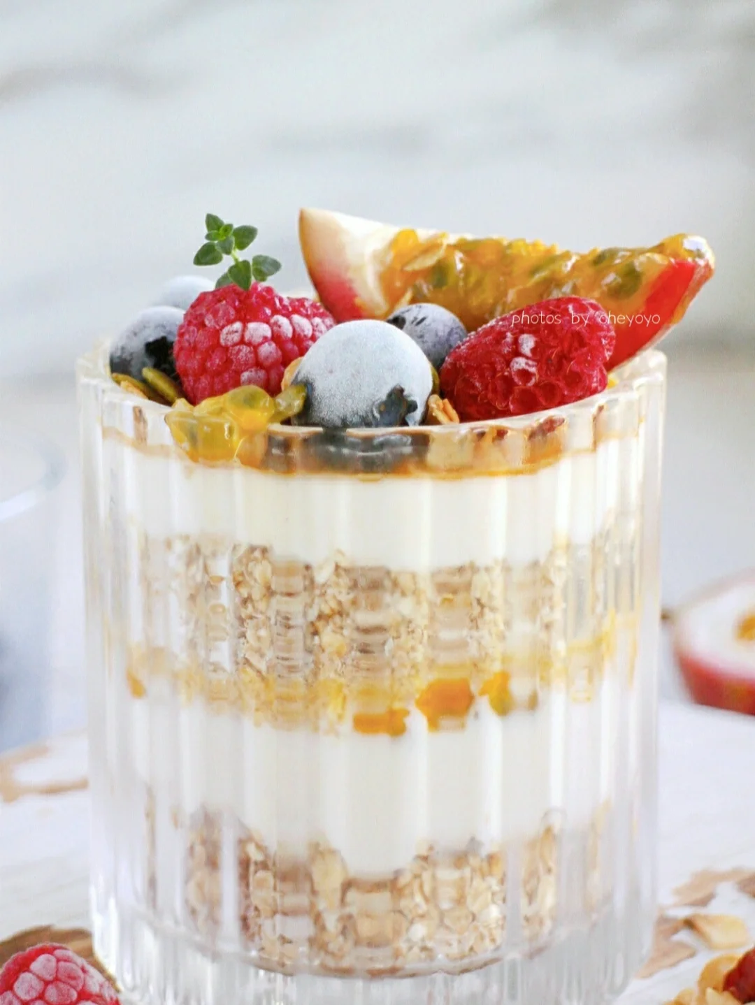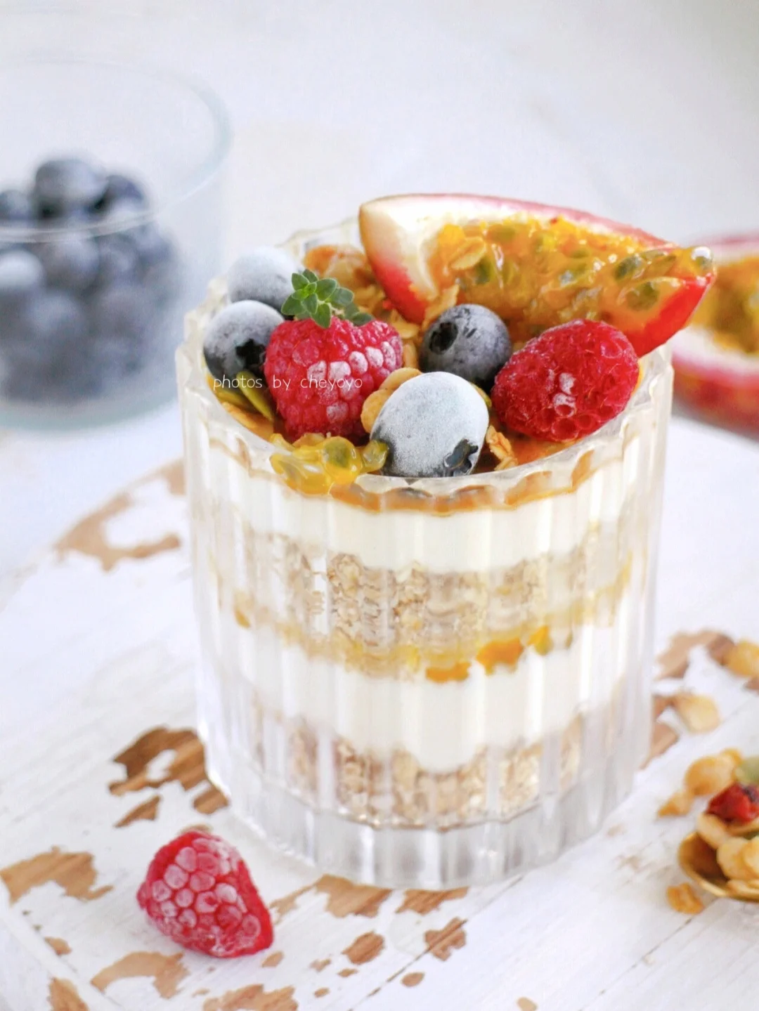 植物奶、酸奶、燕麦、百香果、坚果碎、蓝莓、树莓