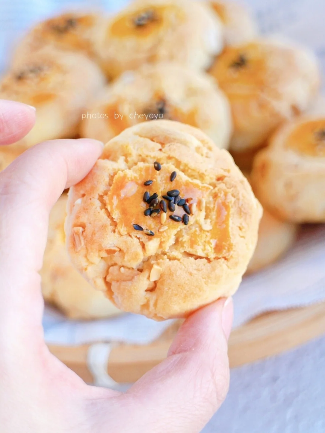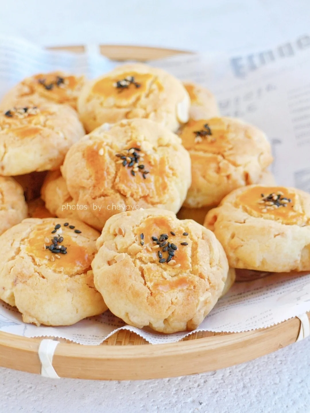 ③ 均匀分成20g小球摆在烤盘上,压扁后刷蛋黄液,撒上芝麻;
