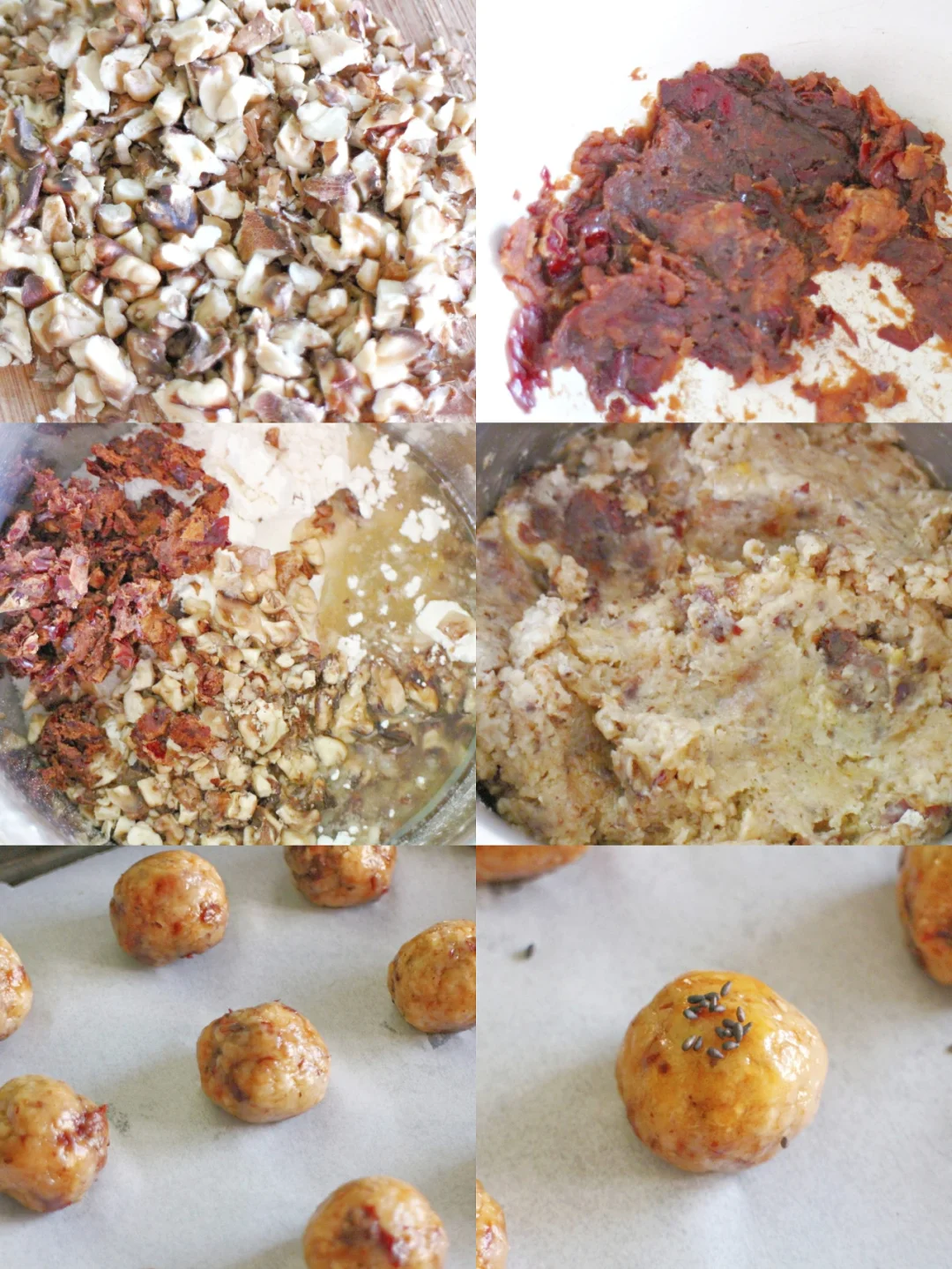 ① 核桃仁切碎,红枣蒸10分钟去核压成泥;