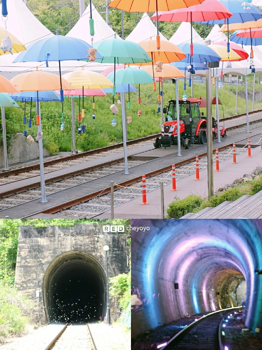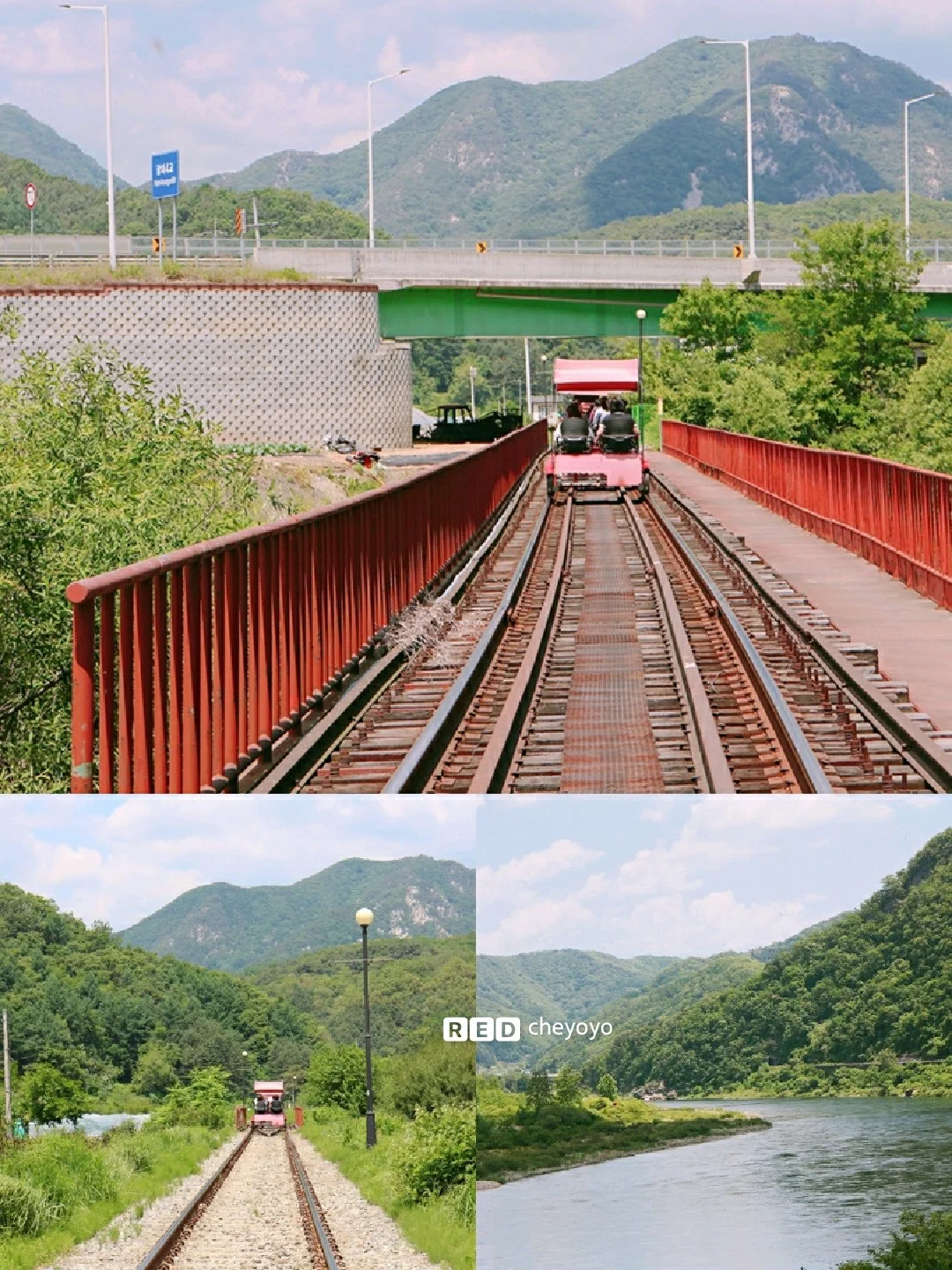 江村铁路自行车是废弃的京春线改造而成,全长8.2公里,沿途风光优美,有大片稻田、山林和河流,因为《Running Man》在这里拍摄而成为热门景点。自行车有2人位和4人位两种,带有手刹,每个整点发车。途中会经过三个隧道,每个隧道都有不一样的惊喜和浪漫,让人禁不住欢呼起来。踩到尽头后是一个休息站,要搭乘铁皮火车到达终点。
