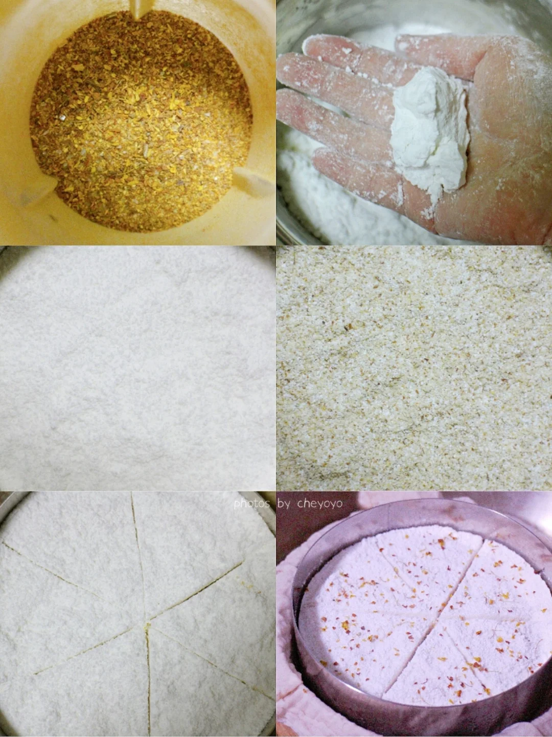 ③ 干桂花和砂糖放料理机中研磨,与65g过筛后的米粉翻拌均匀;