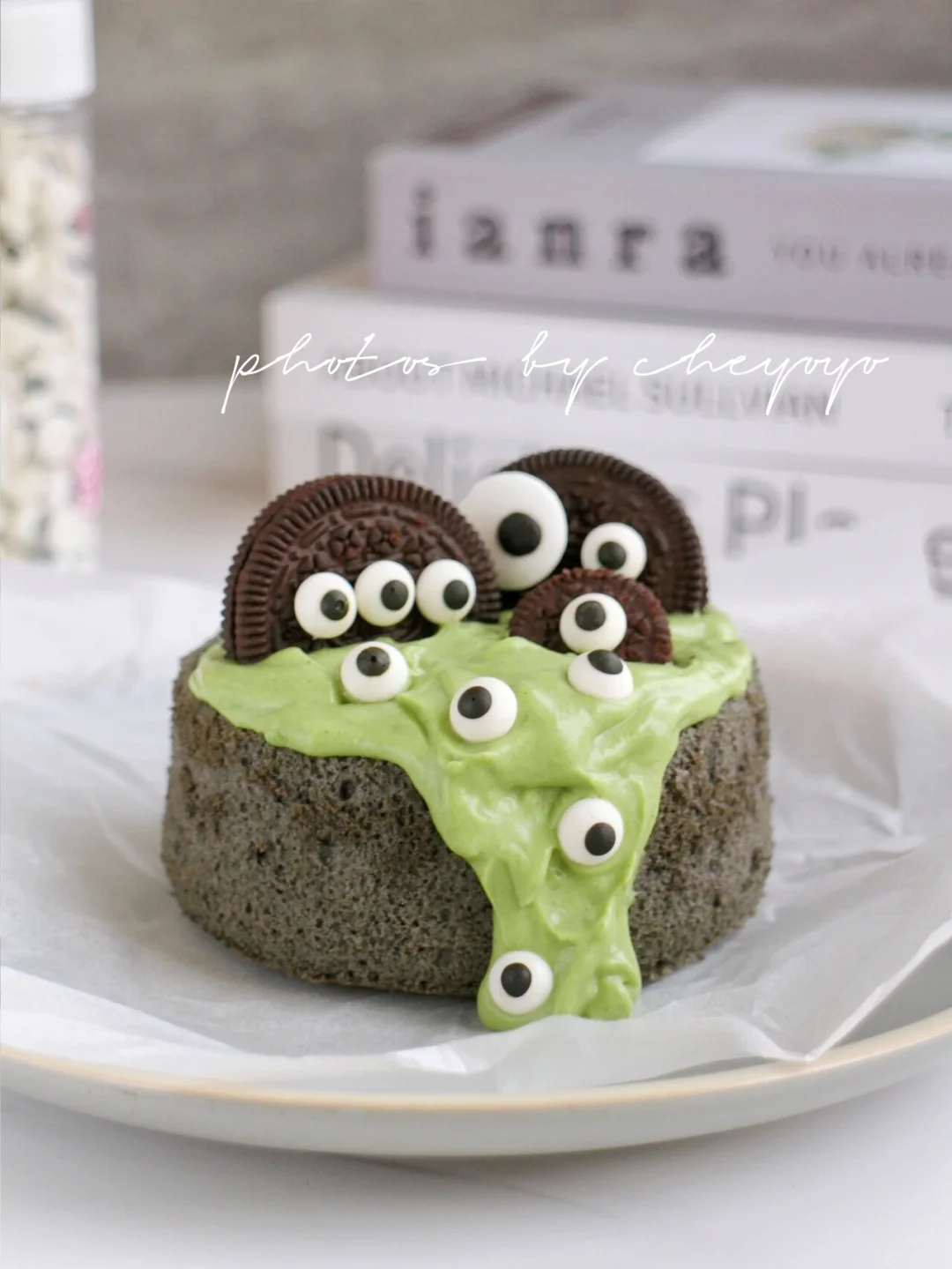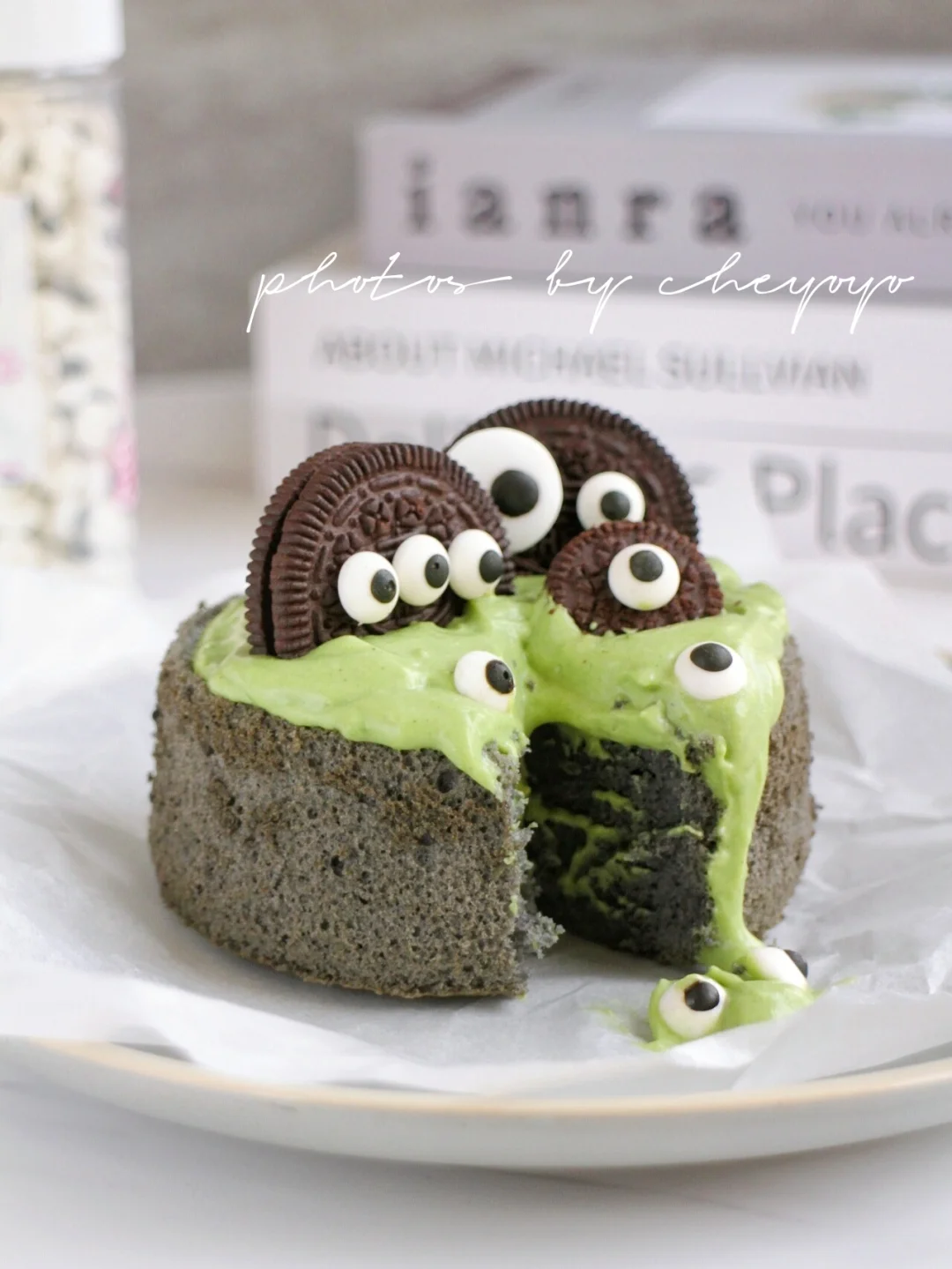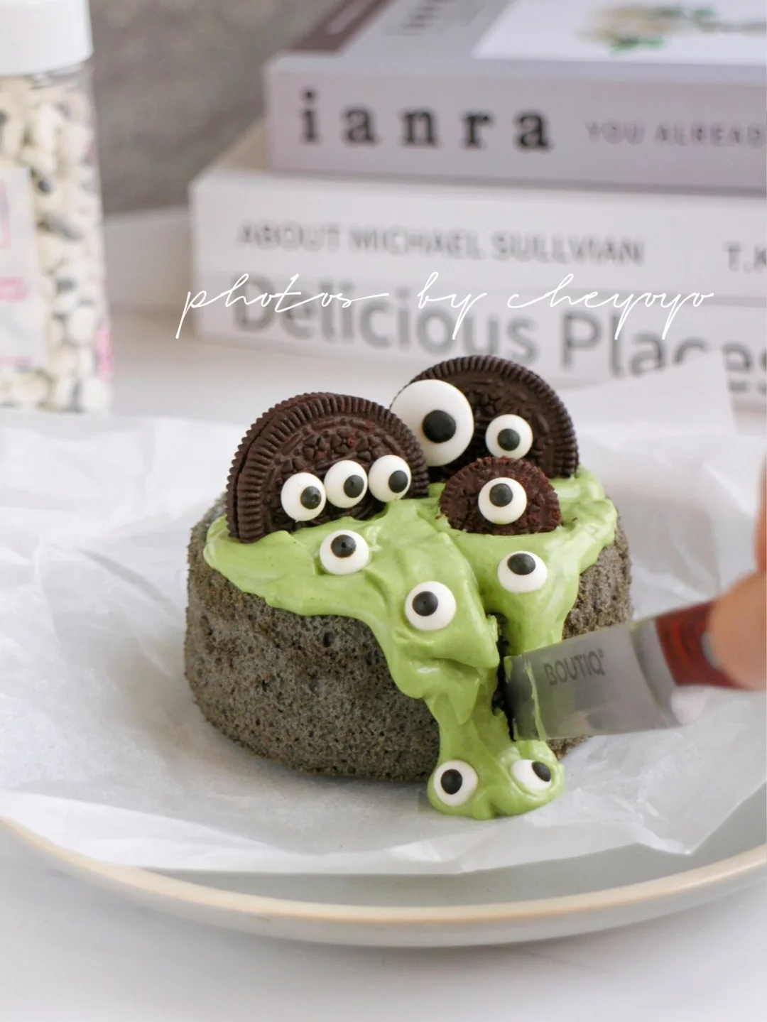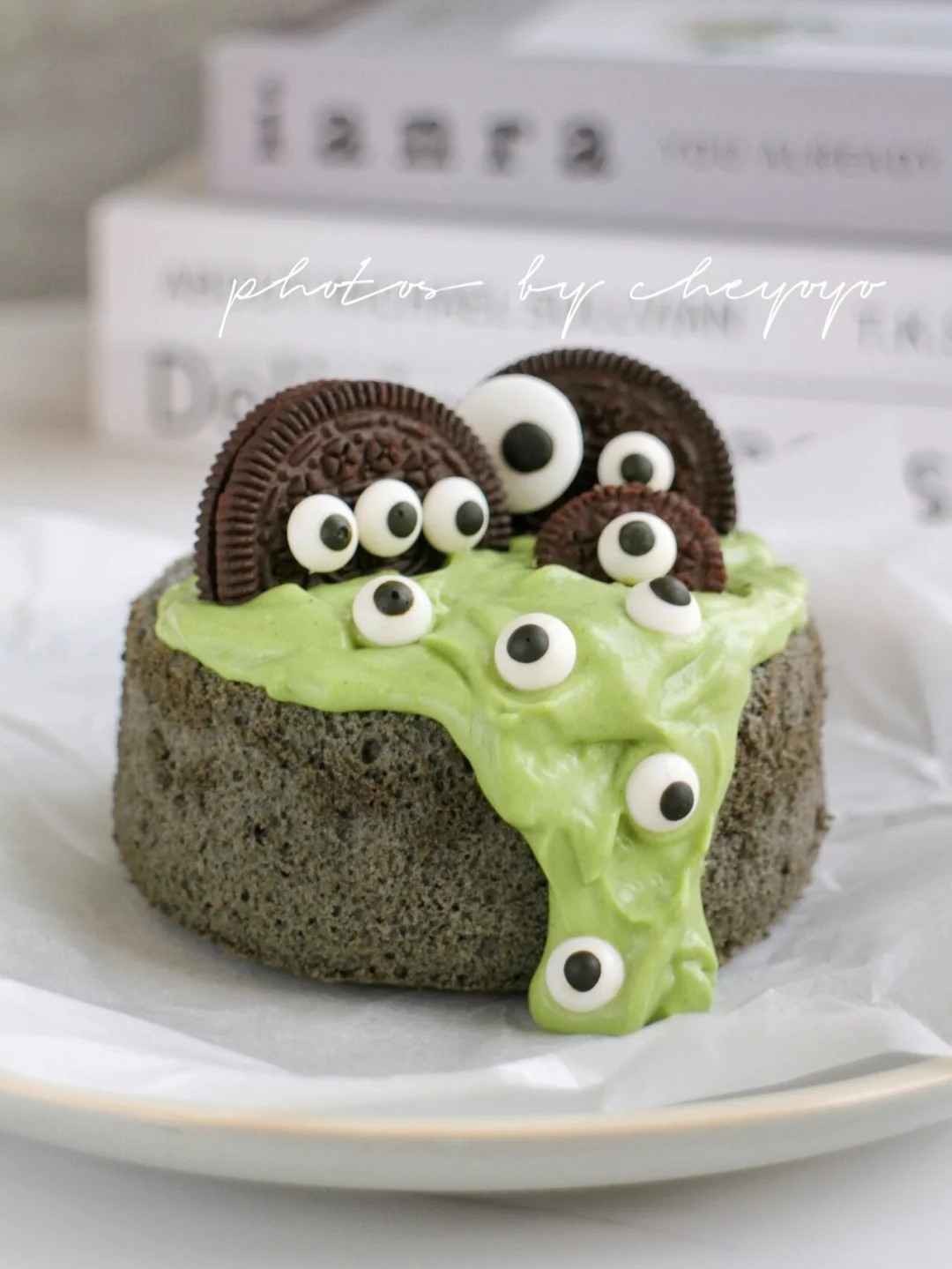哈喽喂~ 爆浆怪物蛋糕来啦,给万圣节增加一些氛围感💫👻不开裂不回缩的4寸完美竹炭戚风,配上抹茶卡仕达酱,又好吃又可爱![萌萌哒R]