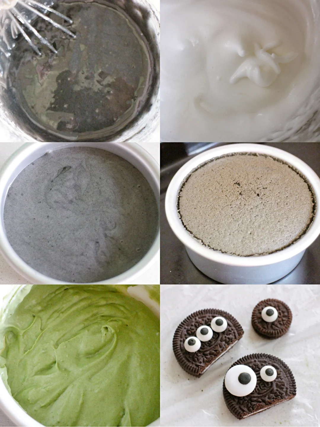 ② 竹炭戚风上铺上抹茶卡仕达酱,摆上奥利奥饼干和眼睛糖就可以喽~