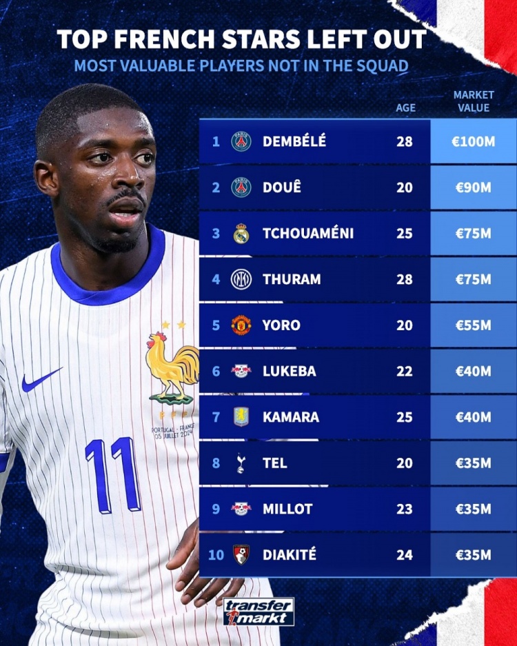 无缘本期法国队球员身价:登贝莱1亿欧最高,杜埃、琼阿梅尼前三
