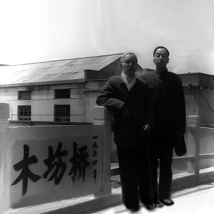在原来祖师殿的位置,先生坐在一把古朴的椅子上,学生胡治均站在他身旁。快门按下时,他仿佛听见了民国36年(1947)3月,石门小学计划重建时的义卖现场,箱底躺着几枚铜板,叮当声里混着小学女生清亮的童谣:“子恺先生,画个春天。”