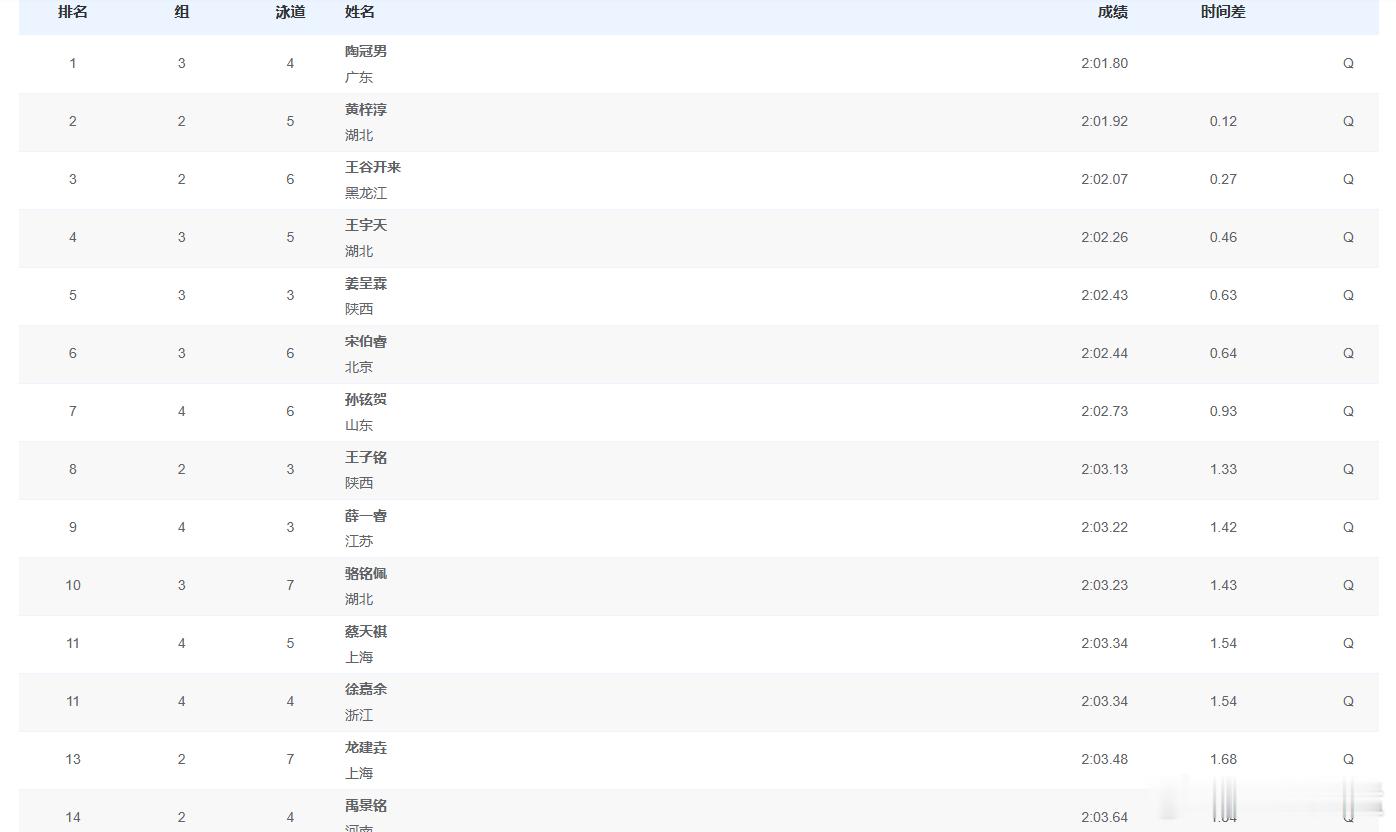 全运游泳男200仰预赛徐嘉余罕见低排位晋级 新国手排名更低通关就行11月14日上午,全运会游泳大项结束了男子200米仰泳预赛,浙江选手徐嘉余游出2分03秒34,排名并列第11位进入半决赛。徐嘉余在第四组出场,前150米稳稳排名第一,后50米完全没有提速冲击的姿态,顺势而为平稳游到了终点,最终拿到并列小组第三。这个成绩对于徐嘉余来说,过于放轻松。但最终还是以总排名并列第11位的资格进入半决赛。第三组出场的广东选手陶冠男以2分01秒80列预赛第一,湖北选手黄梓淳2分01秒92列预赛第二,黑龙江选手王谷开来2分02秒07排名第三。出战了今年世锦赛该项目争夺的河南小将禹景铭排名比徐嘉余还低,他以2分03秒64列预赛第14位晋级。该项目半决赛将在今晚20点23分和20点30分开战。