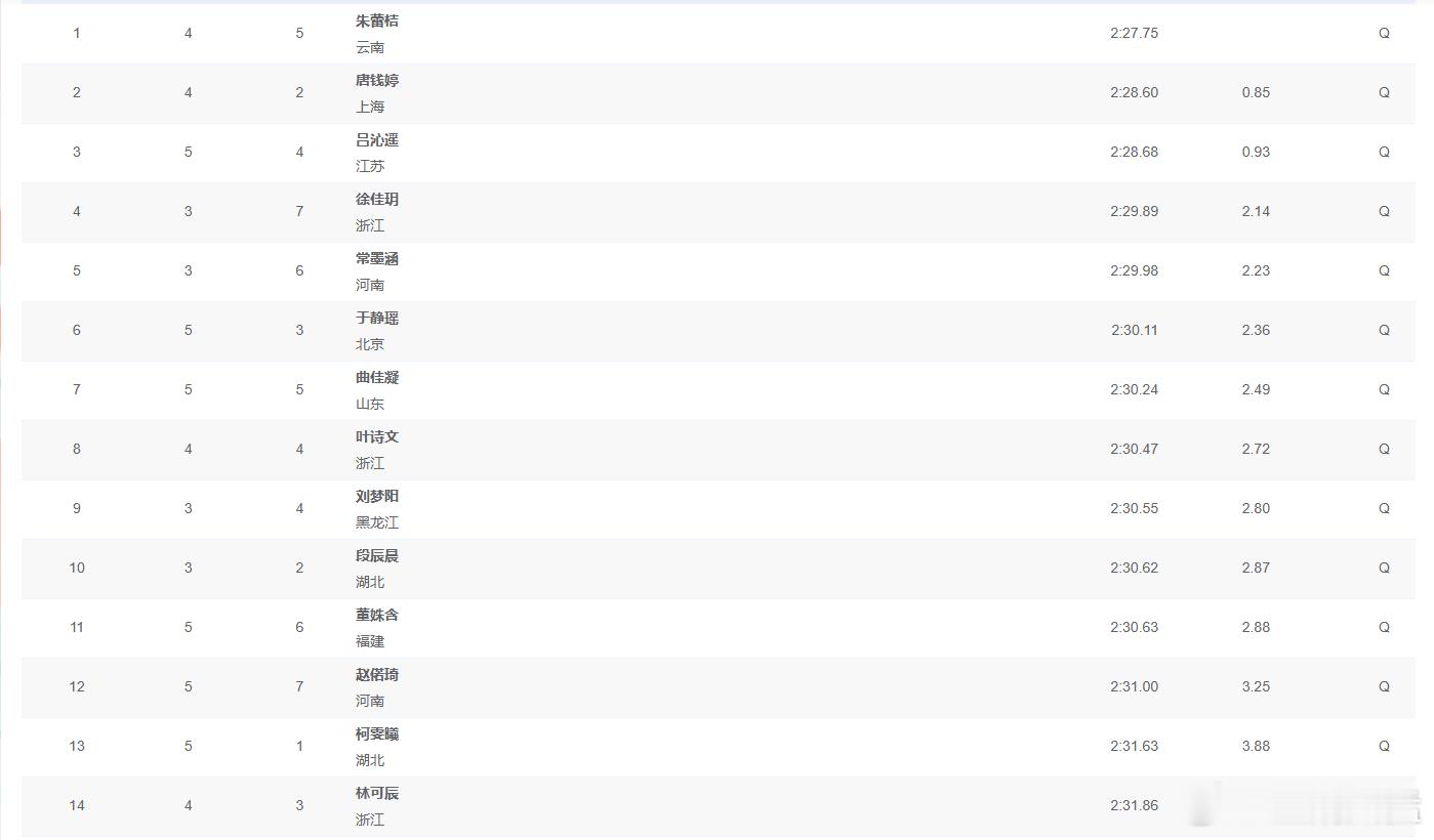 全运女200蛙预赛唐钱婷领衔上届前三集体通关 朱蕾桔头名江苏15岁新人抢眼11月14日上午,全运会游泳大项结束了女子200米蛙泳预赛,上届前三名北京队于静瑶、浙江队叶诗文和上海队唐钱婷,全部顺利晋级。唐钱婷和叶诗文同在第三组出场。这组云南队朱蕾桔全程发挥给力,在最后50米更是加速,超过到了此前领先的唐钱婷,她以2分27秒75拿到小组第一和预赛总第一位。唐钱婷以2分28秒60列小组第二,预赛总排名第二,叶诗文2分30秒47列小组第三,预赛总排名第八。出战了今年世锦赛的15岁江苏选手吕沁遥和上届冠军于静瑶在第四组亮相。今年状态一直很给力的吕沁遥,以2分28秒68列小组第一,预赛总排名第三,于静瑶2分30秒11小组第二,预赛总排名第六。该项目半决赛将在今晚19点38分和19点45分依次展开。