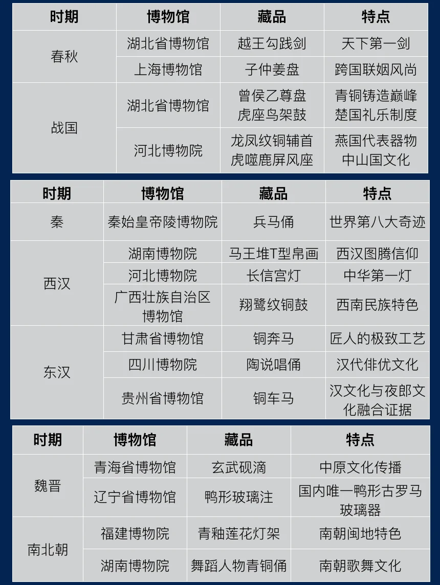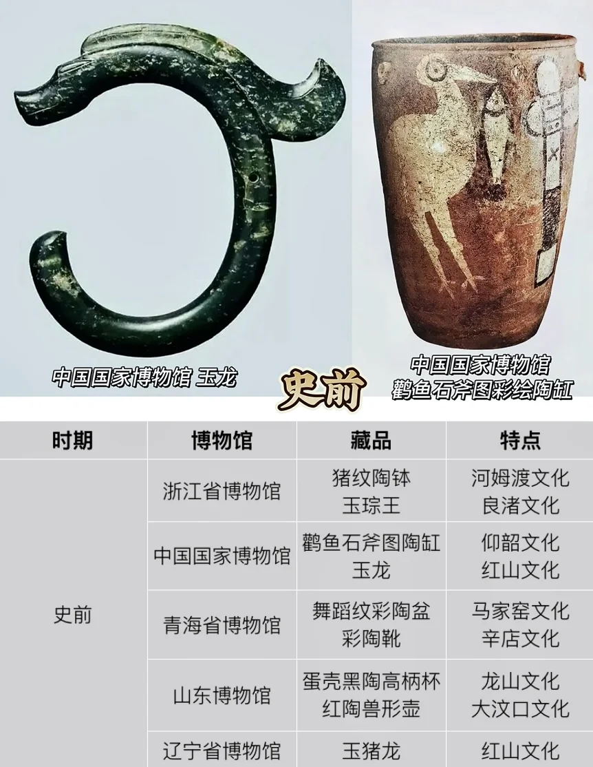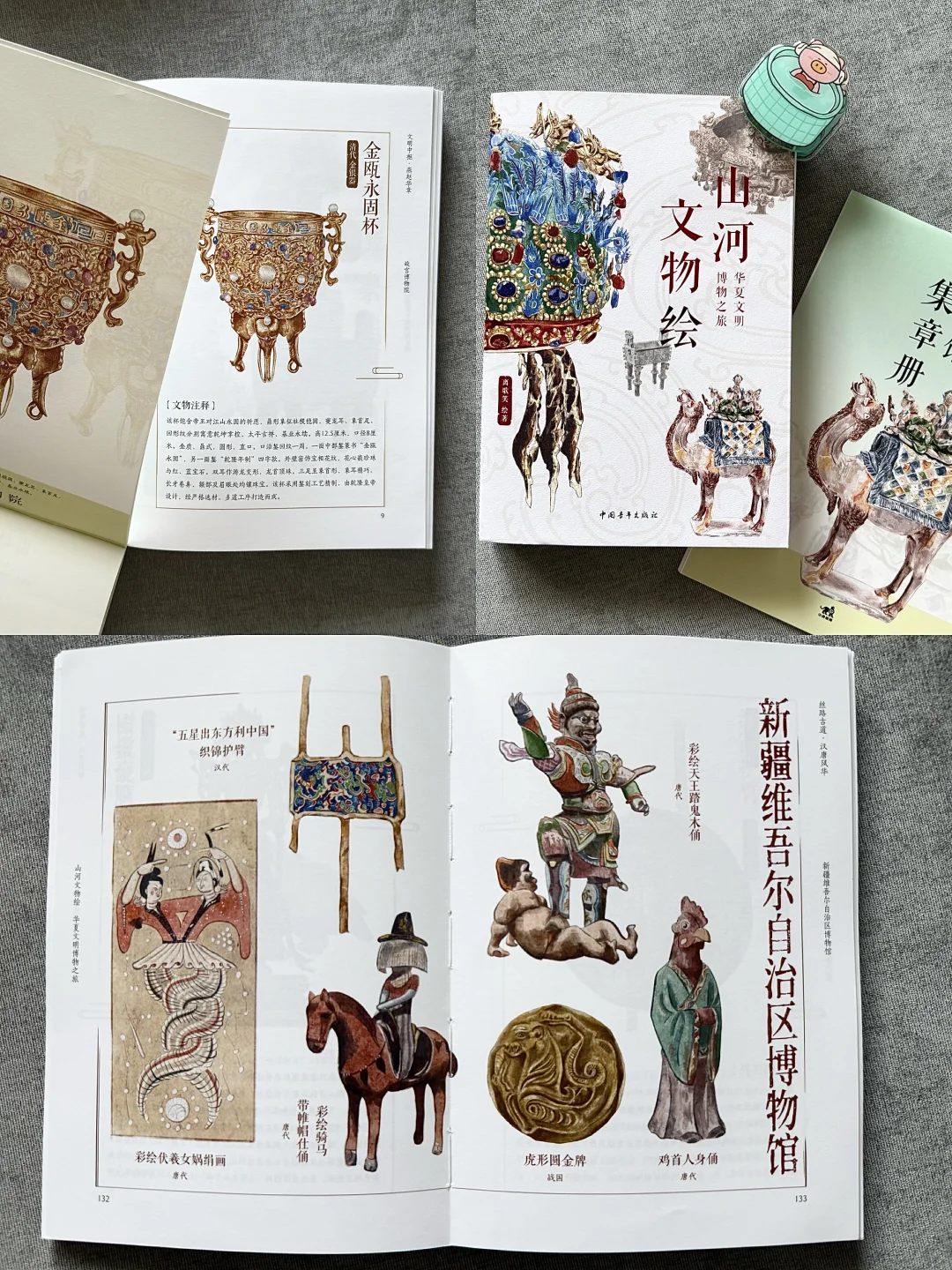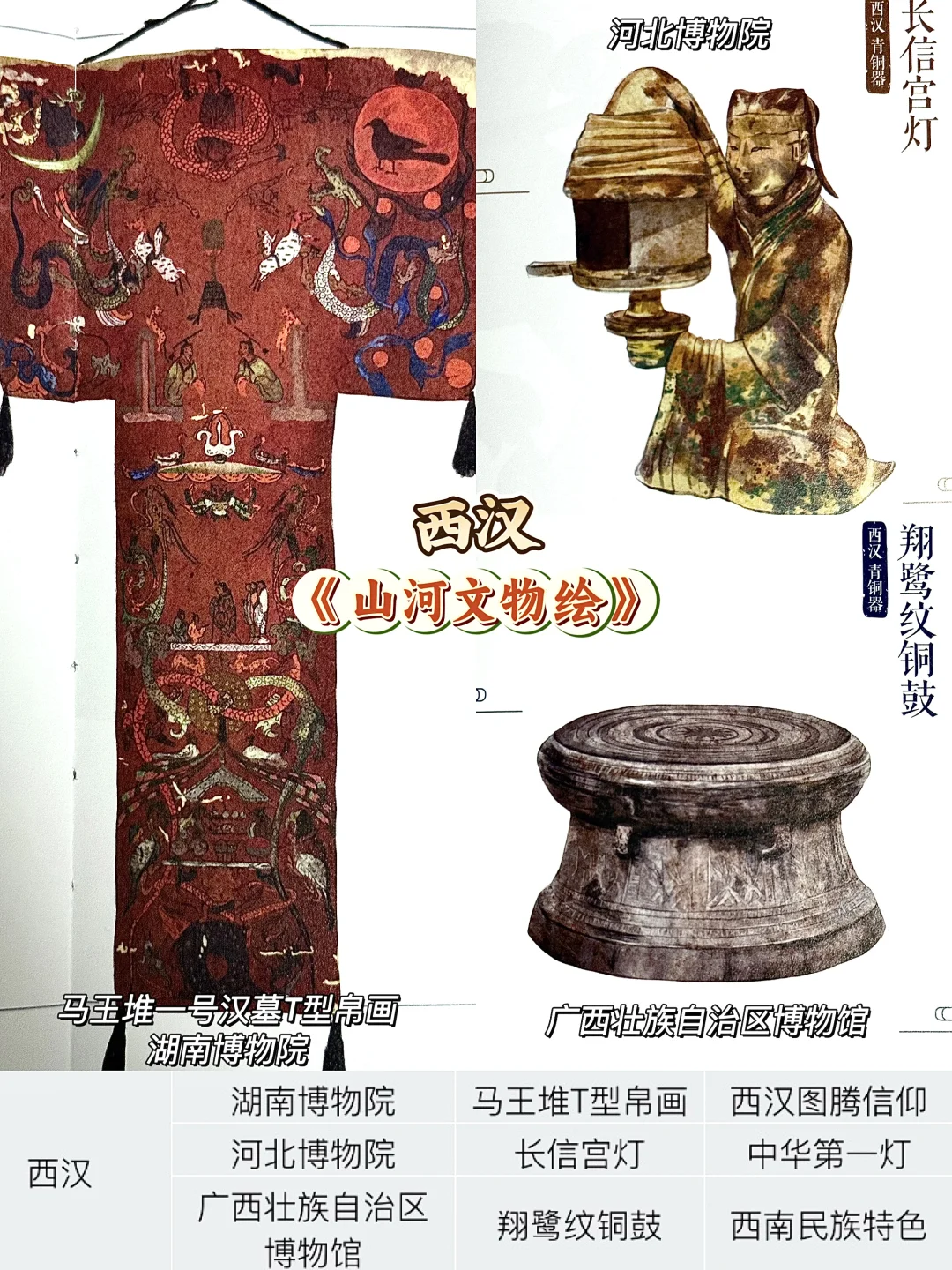 🔹从史前到明清,中国有7个历史阶段被载进形形色色的博物馆里,哪个朝代该去哪儿看?如何理清它们的关系? 通过最近在读的《山河文物绘》,一本介绍了37家重点博物馆224件代表馆藏的书,让我有了些许思路。 🔹史前时代在黄河和长江流域孕育出许多文明,我们可以去浙江省博物馆看河姆渡文化的猪纹陶钵,良渚文化的玉琮王,也可以去国博看仰韶文化的鹳鱼石斧图陶缸,红山文化的玉龙,还可以去青海省博物馆看马家窑文化的舞蹈纹彩陶盆以及辛店文化的彩陶靴。 🔹二里头夏都遗址博物馆证明了夏的存在,商朝建都河南,河南博物院的妇好鸮尊便来自都城殷墟,而在古蜀国,独特的文化体系在三星堆博物馆可以看到。 西周分封统治,陕历博的日己觥和山西博物院的晋侯鸟尊都见证着昔日王公贵族的荣光。 此后战国迎来了各地为政,比如河北博物院,有着燕国的龙凤纹铜辅首,中山国的虎噬鹿屏风座,湖北省博物馆有着曾国的曾侯乙尊盘,楚国的虎座鸟架鼓。 🔹秦汉文化核心在陕西,秦始皇帝陵博物院和汉景帝阳陵博物院都是很好的了解渠道。 此外,湖南博物院有着西汉长沙国丞相利苍家族的陪葬品,广西壮族自治区博物馆有着极具西南民族特色的翔鹭纹铜鼓。 而在东汉,可以去甘肃省博物馆看铜奔马,去贵州省博物馆看铜车马,去四川博物院看说唱俑和摇钱树。 🔹魏晋南北朝时的文物,显现出东西交流和地方特色,比如辽宁省博物馆的古罗马鸭形玻璃注,内蒙古博物院的马鹿头金步摇,福建博物院的青釉莲花灯架等。 到了大唐盛世,一定要去陕历博看看唐三彩和金银器,哦,还有新疆维吾尔自治区博物馆,那里的塑像和绢画,都见证着丝路上的文化流动。 🔹宋代以瓷闻名,在台北故宫博物院能看到汝窑的青瓷和定窑的白瓷,在河南博物院也能看到汝窑的天蓝釉瓷。 此外,黑龙江省博物馆的铜坐龙为金代皇室御用,宁夏博物馆的鎏金铜牛代表着西夏最高工艺,内蒙古博物院的摩羯形提梁注壶展现了辽代的契丹特色。 🔹元代景德镇发展到新高度,江西省博物馆的青花釉里红阁楼式人物谷仓和青花松竹梅纹瓶都是代表。 而明清经历了都城从南京到北京的转换,我们也能从南京博物院金蝉玉叶、釉里红三友梅瓶到故宫博物院的金瓯永固杯、郎窑红釉穿带直口瓶看到上层的审美变化。 中国历史源远流长,而我们的好奇心,都将成为它延续的一环,观展如此,阅读亦是如此。