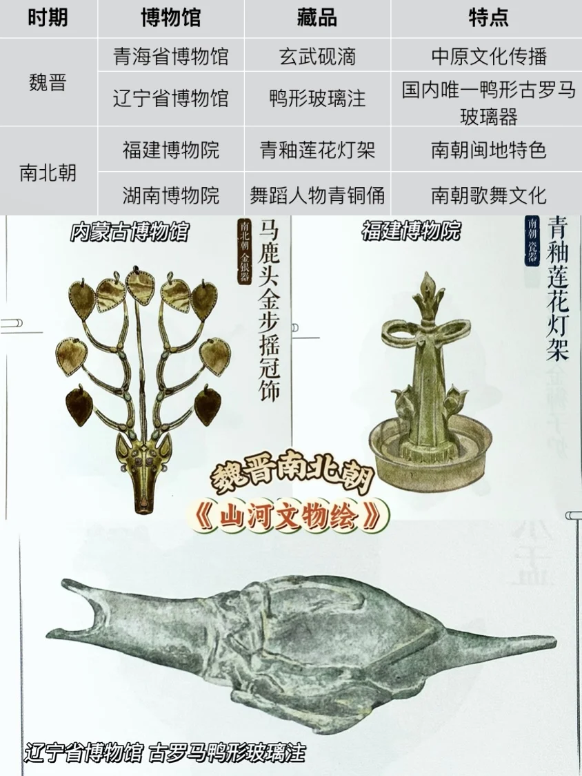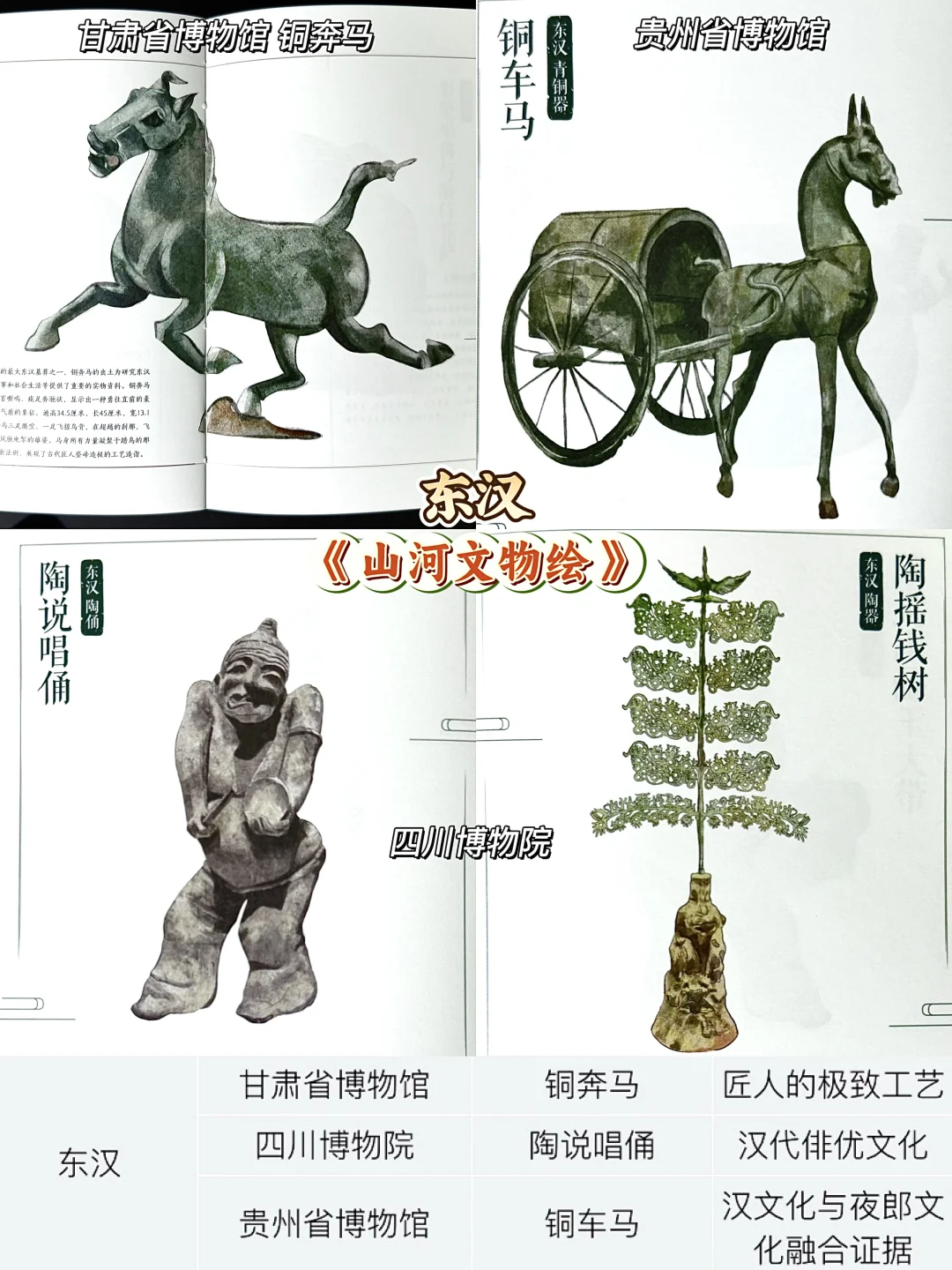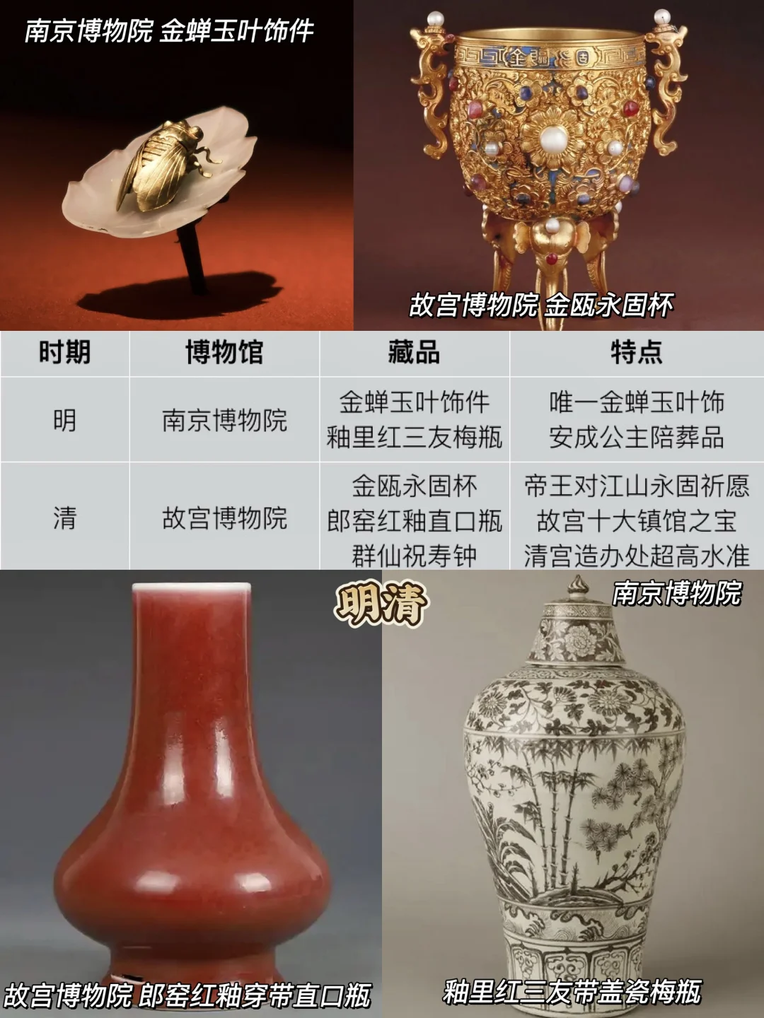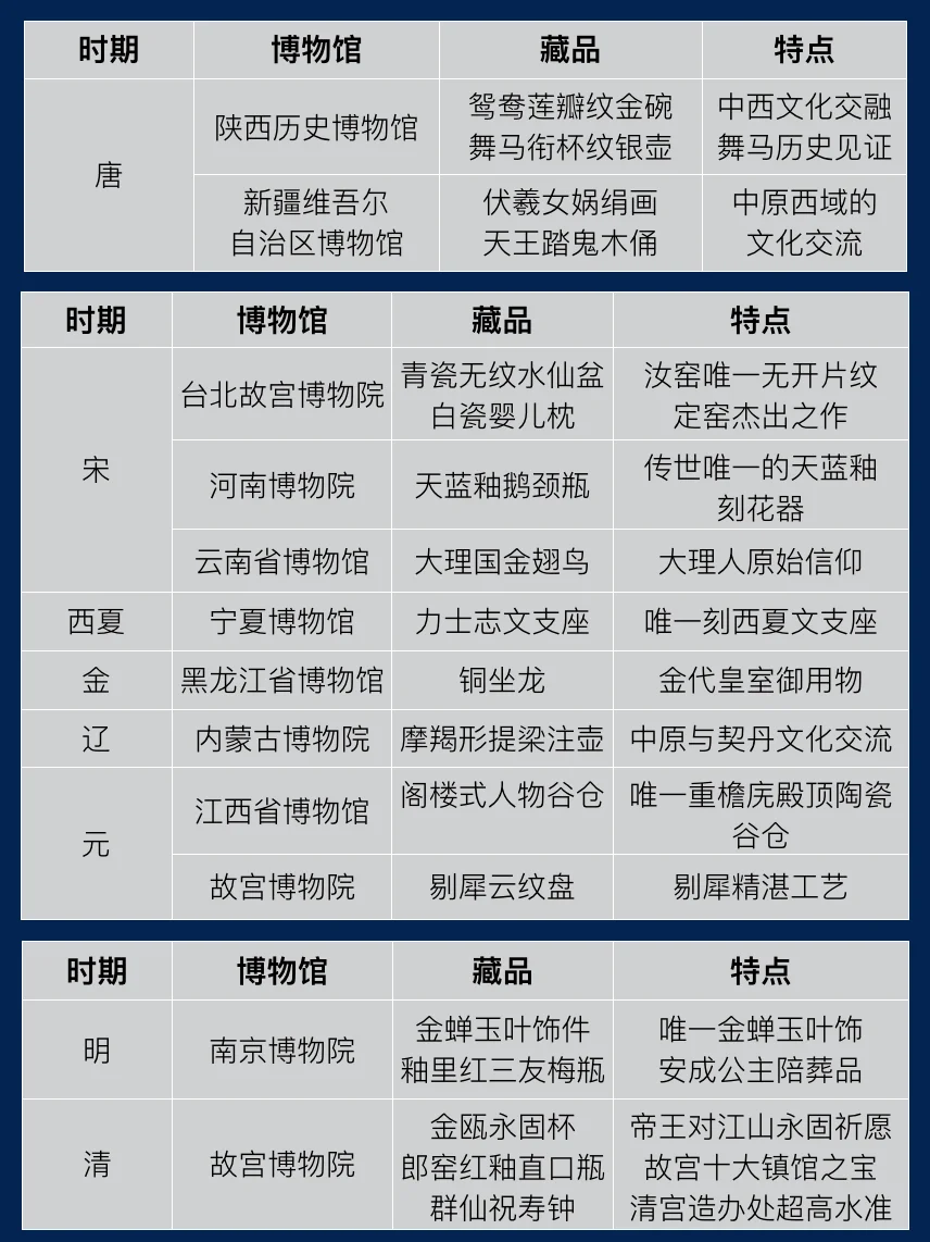 🔹从史前到明清,中国有7个历史阶段被载进形形色色的博物馆里,哪个朝代该去哪儿看?如何理清它们的关系? 通过最近在读的《山河文物绘》,一本介绍了37家重点博物馆224件代表馆藏的书,让我有了些许思路。 🔹史前时代在黄河和长江流域孕育出许多文明,我们可以去浙江省博物馆看河姆渡文化的猪纹陶钵,良渚文化的玉琮王,也可以去国博看仰韶文化的鹳鱼石斧图陶缸,红山文化的玉龙,还可以去青海省博物馆看马家窑文化的舞蹈纹彩陶盆以及辛店文化的彩陶靴。 🔹二里头夏都遗址博物馆证明了夏的存在,商朝建都河南,河南博物院的妇好鸮尊便来自都城殷墟,而在古蜀国,独特的文化体系在三星堆博物馆可以看到。 西周分封统治,陕历博的日己觥和山西博物院的晋侯鸟尊都见证着昔日王公贵族的荣光。 此后战国迎来了各地为政,比如河北博物院,有着燕国的龙凤纹铜辅首,中山国的虎噬鹿屏风座,湖北省博物馆有着曾国的曾侯乙尊盘,楚国的虎座鸟架鼓。 🔹秦汉文化核心在陕西,秦始皇帝陵博物院和汉景帝阳陵博物院都是很好的了解渠道。 此外,湖南博物院有着西汉长沙国丞相利苍家族的陪葬品,广西壮族自治区博物馆有着极具西南民族特色的翔鹭纹铜鼓。 而在东汉,可以去甘肃省博物馆看铜奔马,去贵州省博物馆看铜车马,去四川博物院看说唱俑和摇钱树。 🔹魏晋南北朝时的文物,显现出东西交流和地方特色,比如辽宁省博物馆的古罗马鸭形玻璃注,内蒙古博物院的马鹿头金步摇,福建博物院的青釉莲花灯架等。 到了大唐盛世,一定要去陕历博看看唐三彩和金银器,哦,还有新疆维吾尔自治区博物馆,那里的塑像和绢画,都见证着丝路上的文化流动。 🔹宋代以瓷闻名,在台北故宫博物院能看到汝窑的青瓷和定窑的白瓷,在河南博物院也能看到汝窑的天蓝釉瓷。 此外,黑龙江省博物馆的铜坐龙为金代皇室御用,宁夏博物馆的鎏金铜牛代表着西夏最高工艺,内蒙古博物院的摩羯形提梁注壶展现了辽代的契丹特色。 🔹元代景德镇发展到新高度,江西省博物馆的青花釉里红阁楼式人物谷仓和青花松竹梅纹瓶都是代表。 而明清经历了都城从南京到北京的转换,我们也能从南京博物院金蝉玉叶、釉里红三友梅瓶到故宫博物院的金瓯永固杯、郎窑红釉穿带直口瓶看到上层的审美变化。 中国历史源远流长,而我们的好奇心,都将成为它延续的一环,观展如此,阅读亦是如此。