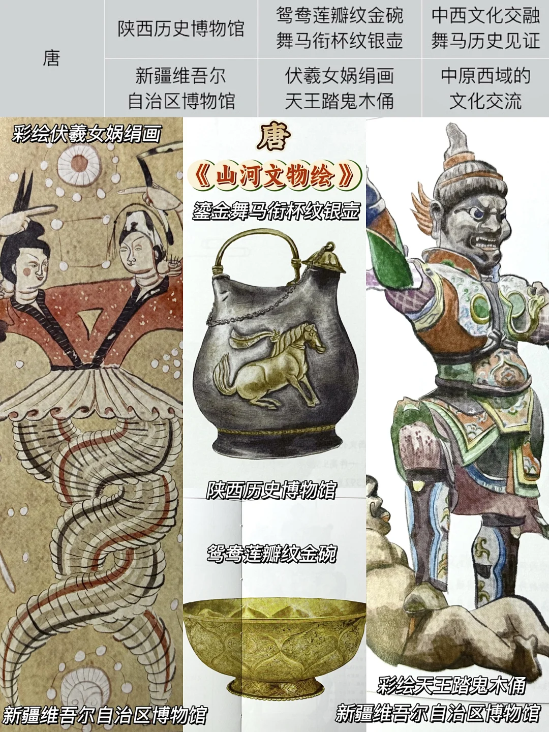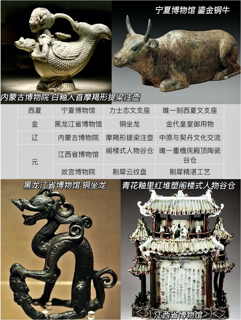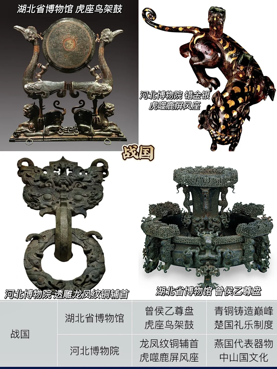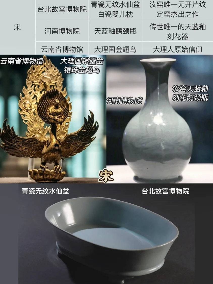 🔹从史前到明清,中国有7个历史阶段被载进形形色色的博物馆里,哪个朝代该去哪儿看?如何理清它们的关系? 通过最近在读的《山河文物绘》,一本介绍了37家重点博物馆224件代表馆藏的书,让我有了些许思路。 🔹史前时代在黄河和长江流域孕育出许多文明,我们可以去浙江省博物馆看河姆渡文化的猪纹陶钵,良渚文化的玉琮王,也可以去国博看仰韶文化的鹳鱼石斧图陶缸,红山文化的玉龙,还可以去青海省博物馆看马家窑文化的舞蹈纹彩陶盆以及辛店文化的彩陶靴。 🔹二里头夏都遗址博物馆证明了夏的存在,商朝建都河南,河南博物院的妇好鸮尊便来自都城殷墟,而在古蜀国,独特的文化体系在三星堆博物馆可以看到。 西周分封统治,陕历博的日己觥和山西博物院的晋侯鸟尊都见证着昔日王公贵族的荣光。 此后战国迎来了各地为政,比如河北博物院,有着燕国的龙凤纹铜辅首,中山国的虎噬鹿屏风座,湖北省博物馆有着曾国的曾侯乙尊盘,楚国的虎座鸟架鼓。 🔹秦汉文化核心在陕西,秦始皇帝陵博物院和汉景帝阳陵博物院都是很好的了解渠道。 此外,湖南博物院有着西汉长沙国丞相利苍家族的陪葬品,广西壮族自治区博物馆有着极具西南民族特色的翔鹭纹铜鼓。 而在东汉,可以去甘肃省博物馆看铜奔马,去贵州省博物馆看铜车马,去四川博物院看说唱俑和摇钱树。 🔹魏晋南北朝时的文物,显现出东西交流和地方特色,比如辽宁省博物馆的古罗马鸭形玻璃注,内蒙古博物院的马鹿头金步摇,福建博物院的青釉莲花灯架等。 到了大唐盛世,一定要去陕历博看看唐三彩和金银器,哦,还有新疆维吾尔自治区博物馆,那里的塑像和绢画,都见证着丝路上的文化流动。 🔹宋代以瓷闻名,在台北故宫博物院能看到汝窑的青瓷和定窑的白瓷,在河南博物院也能看到汝窑的天蓝釉瓷。 此外,黑龙江省博物馆的铜坐龙为金代皇室御用,宁夏博物馆的鎏金铜牛代表着西夏最高工艺,内蒙古博物院的摩羯形提梁注壶展现了辽代的契丹特色。 🔹元代景德镇发展到新高度,江西省博物馆的青花釉里红阁楼式人物谷仓和青花松竹梅纹瓶都是代表。 而明清经历了都城从南京到北京的转换,我们也能从南京博物院金蝉玉叶、釉里红三友梅瓶到故宫博物院的金瓯永固杯、郎窑红釉穿带直口瓶看到上层的审美变化。 中国历史源远流长,而我们的好奇心,都将成为它延续的一环,观展如此,阅读亦是如此。