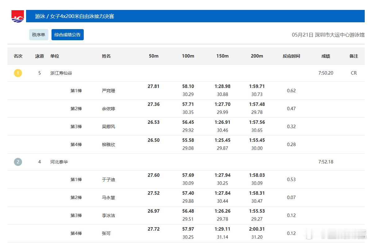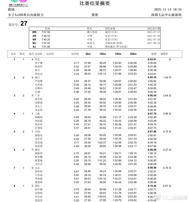 全运女4X200自预赛李冰洁领衔河北夺第一 最强版浙江队决赛或再现世界前六水准!11月14日上午,全运会游泳大项结束了女子4X200米自由泳预赛争夺,刘子璇、张靖岩、张可和李冰洁组成的河北队,以8分03秒81排名预赛第一。严窕珊、毛奕菡、吴卿风和吕越组成的浙江队,以8分05秒35排名预赛第二。预赛焦点战役集中在第二组浙江和广东之争。排出俞李妍、汤慕涵、李杰兰和李家萍的广东队,和浙江队竞争激烈。四棒李家萍在前150米领先的前提下,最后50米被吕越超出。看得出昨天200自决赛对李家萍的影响。争冠焦点无疑将集中在浙江、河北和广东三家。由于广东队已经接近把预赛当决赛来游,阵容里能调整进的只有劳丽慧。河北和浙江的决赛阵容之争,才是王中王对决。以今年全国冠军赛为准,河北队决赛要上于子迪和马永慧。于子迪缺席了本届全运会200自决赛之争,她眼下的200自最强实力正好可以看个清晰。从国家队到省队,李冰洁在4X200自接力比赛里的发挥,无疑将起到极其关键的作用。但浙江队依然占有整体优势。4X200自阵容里还有余依婷和柳雅欣两张王牌可以打。此外从本届全运200自单项比拼状况来看,范亚琦和孔雅琪也具备了很高水准。预赛出场的四将,除了吴卿风,其他三个位置应该都要被调整到最强配置。今年全国冠军赛,严窕珊、余依婷、吴卿风和柳雅欣组成的浙江队,以7分50秒20夺冠,创造赛事纪录。省队能到7分50秒左右令人震撼,放在奥运会上也是世界前六水平。而从当下浙江队的配置来看,决赛或能冲进7分50秒之内。