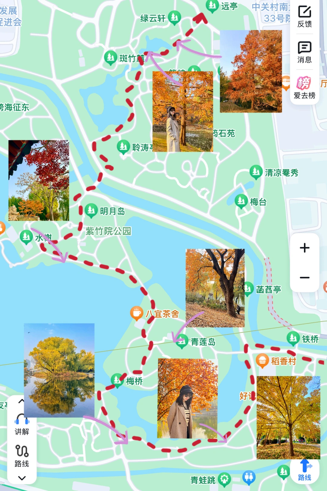 ✅南门进→荷花渡→南小湖南岸(神树)→梅桥→揽翠亭(整片落叶)→虹桥→问月楼(枫叶)→聆涛亭→斑竹麓→翠池(杉树)→行宫(古银杏)→北门出