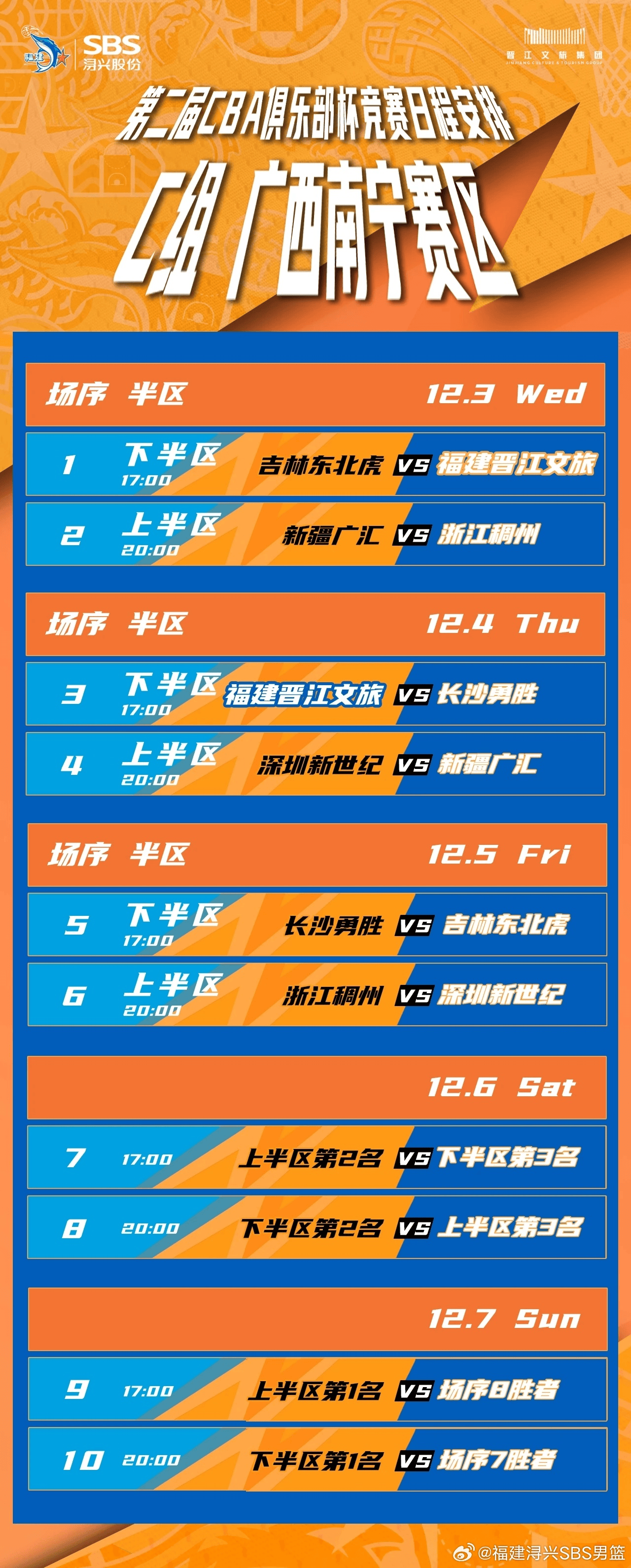 第二届CBA俱乐部杯小组赛C组将于2025年12月3日-8日在广西南宁进行,主队福建晋江文旅男篮与新疆广汇、浙江稠州、深圳新世纪、吉林东北虎以及长沙勇胜同组竞技!
