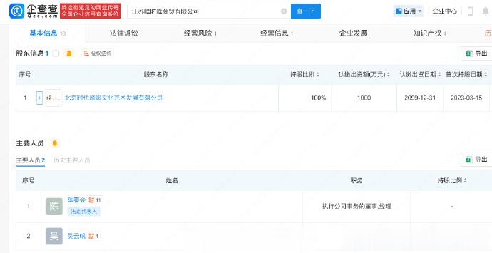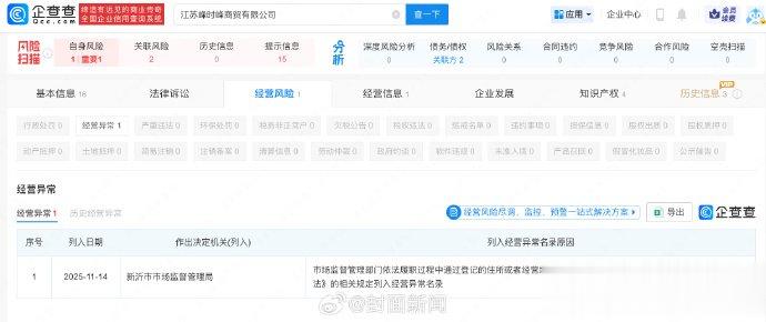 [#时代峰峻旗下公司经营异常#]企查查APP显示,11月14日,江苏峰时峰商贸有限公司因“通过登记的住所或者经营场所无法取得联系”被列入经营异常名录,决定机关为新沂市市场监督管理局。企查查信息显示,该公司成立于2023年3月,注册资本1000万,陈春会担任法定代表人、董事,由北京时代峰峻文化艺术发展有限公司全资持股。(封面新闻)