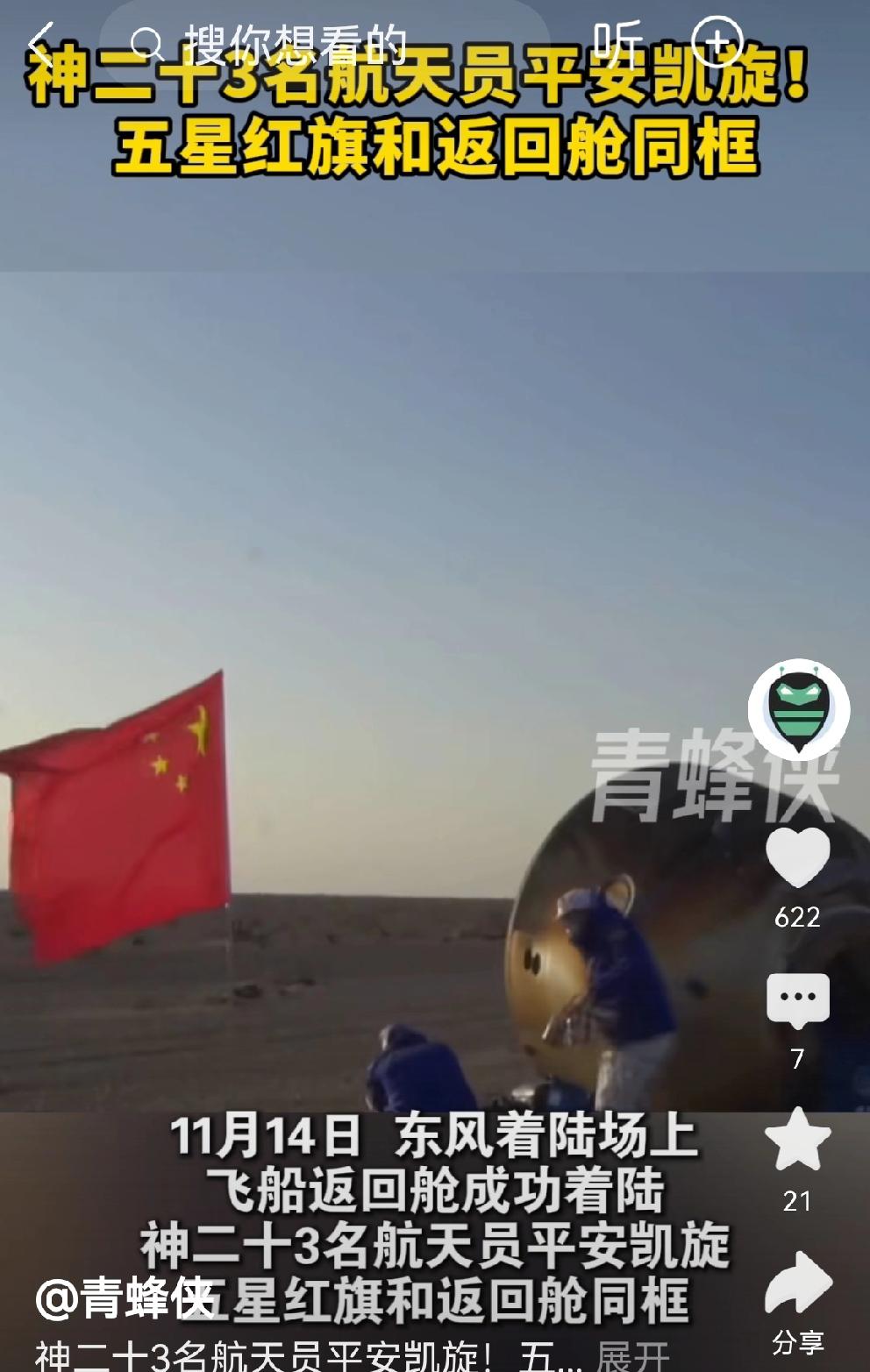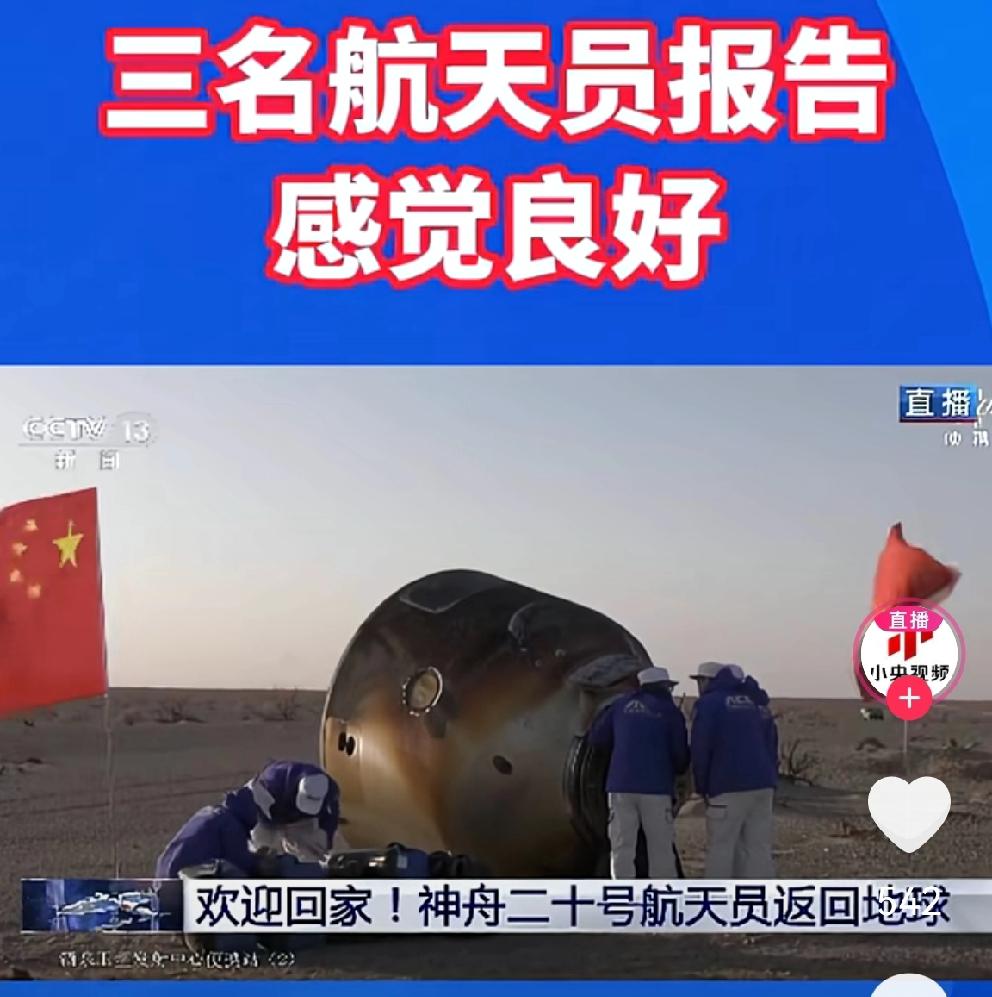 神二十返回舱传出报平安的佳音: “北京, 我是神舟二十号航天乘组 已经安全落地 航天员状态良好” 这是返回舱里传出来的声音 三名英雄航天员终于回家了! 全国人民悬着的一颗心也落地啦! 这一刻,返回舱与五星红旗同框,令人热泪盈眶[给力][给力] 伟大的航天员,欢迎👏回家![比心] 伟大的中国航天,再次创造了奇迹[赞] 伟大的祖国,我为你自豪为你骄傲[给力]