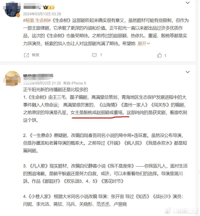 《生命树》用赵丽颖的名字热饼至少3年从2021年开始,就一直说正午阳光的《生命树》由赵丽颖出演,直到2024年,赵丽颖对接这边才辟谣了这个饼,然后传到了杨紫身上,不过正午阳光也为此多次发布声明辟谣,说《生命树》还在筹备,演员未定,再到后来官宣杨紫,然后赵丽颖被说舔饼失败,赵丽颖虽然没出演这部剧,但确实是免费给热饼3年。