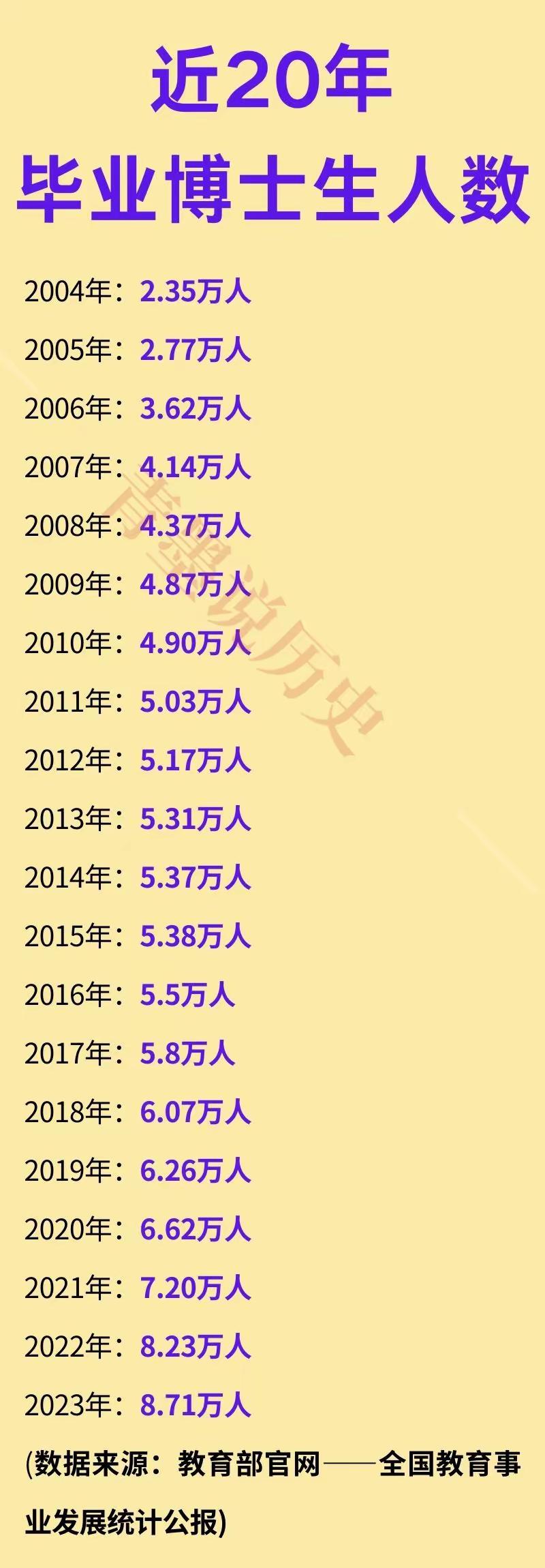 我国的博士数量已经远超英国,但是还没有追上美国。 我国第一位获得博士学位的人叫马中骐,他是1982年获得的。 到了1998年,由于我国的高校扩招政策全面启动,除了本科招生,连博士招生也井喷了,尤其是1998年到2005年,是博士招生的黄金时期。 虽然在社会上有很多人在叫嚣学历贬值,那只是低级学历的贬值,博士还远远不到贬值的时候。 我国目前约有100万博士学位获得者,英国只有40多万,而美国有超过300万,距离美国差距还是很大的。 希望我国的博士学位获得者越来越多,民族复兴的伟业就在他们的肩上!