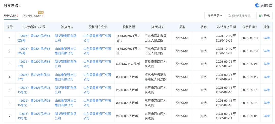 从今年5月宣布收购事项到公告终止,交易历时5个多月,原因是“《股权转让协议》约定的交割先决条件未能满足”。天眼查数据显示,自今年9月以来,即墨黄酒接连新增7项股权冻结事项,当前累计被冻结股权数额超1亿元。