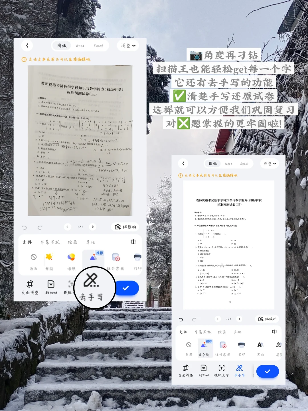 我在做练习题滴时候,总是喜欢在边上标注,等我想再做一遍的时候我就很苦恼有我上次做过的痕迹,现在我有这个⭐夸克扫描王⭐了,再也不用担心这个了,扫描做过的试卷或习题册,一键去除手写笔迹,还原干净空白试卷,方便我再次巩固复习!再也不用特地去搜扫描图片怎么弄了,一个a-pp都搞定了!