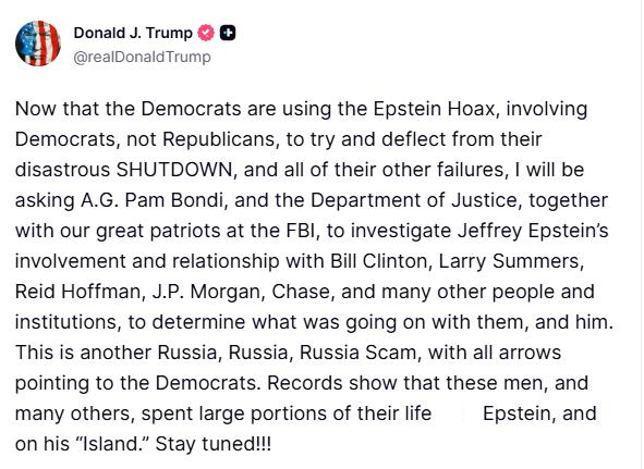🐖 特朗普:“我将要求司法部长帕姆·邦迪、司法部,以及联邦调查局的“杰出爱国者们”,调查杰弗里·爱泼斯坦与比尔·克林顿、拉里·萨默斯、里德·霍夫曼、摩根大通、大通银行以及众多其他个人和机构的关联与关系,查明他们与他之间到底发生了什么。这又是一场‘通俄门’式的骗局,所有矛头都指向民主党人。记录显示,这些人以及其他许多人,一生中大部分时间都与爱泼斯坦共度,且曾出入他的‘岛屿’。”语无伦次这一块