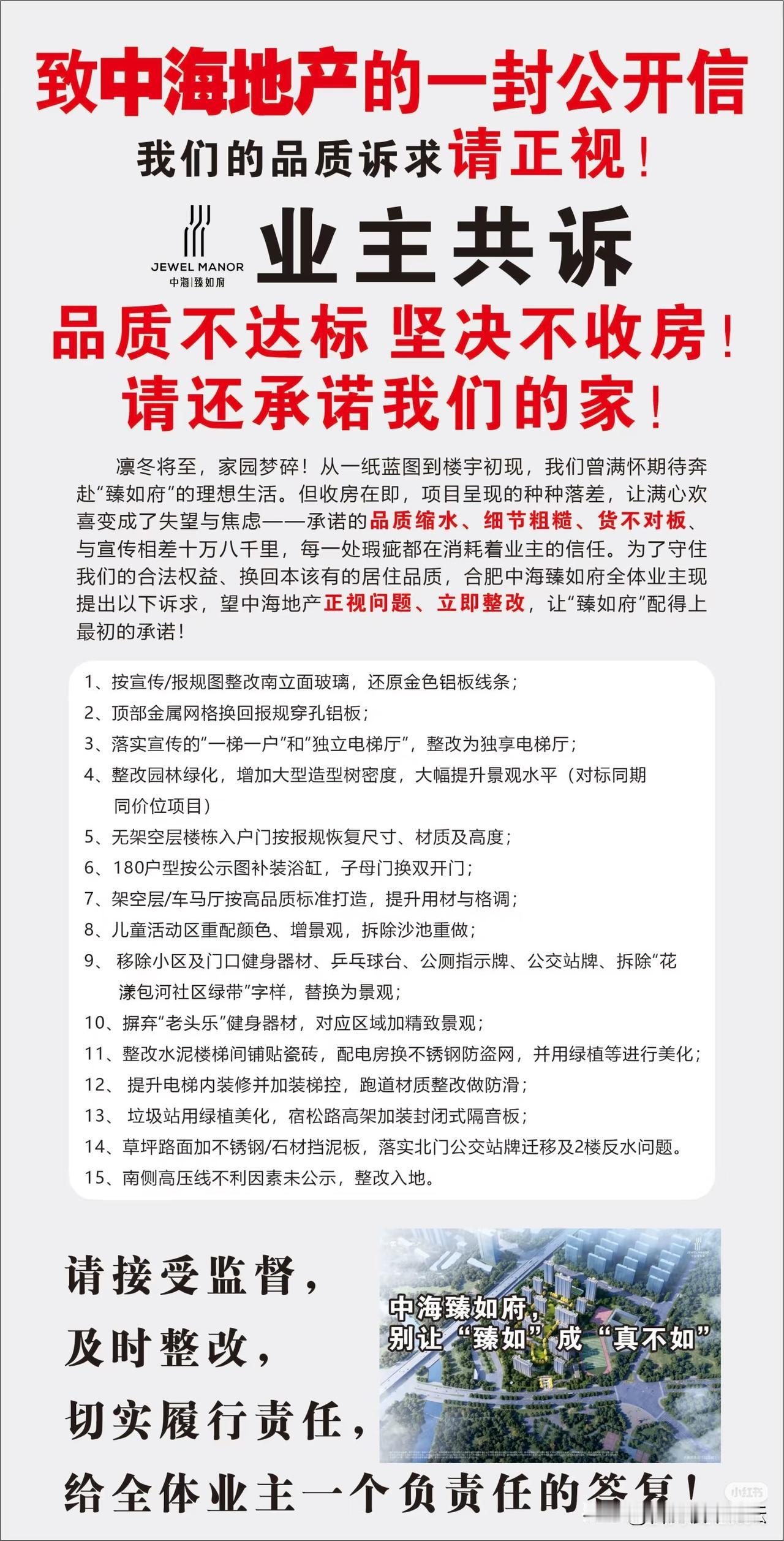 中海在合肥的口碑其实也一般。这个年头买新房的要求也不低,但是价格高,开发商宣传的好,然后交房就不一样了。中海臻如府卖的时候的确宣传的是不得了,看来现在问题也很多。不过高压线要入地,这个有些不可能吧! 主要是这个年头买房都糟心,假如交房就涨价看可有这些问题。