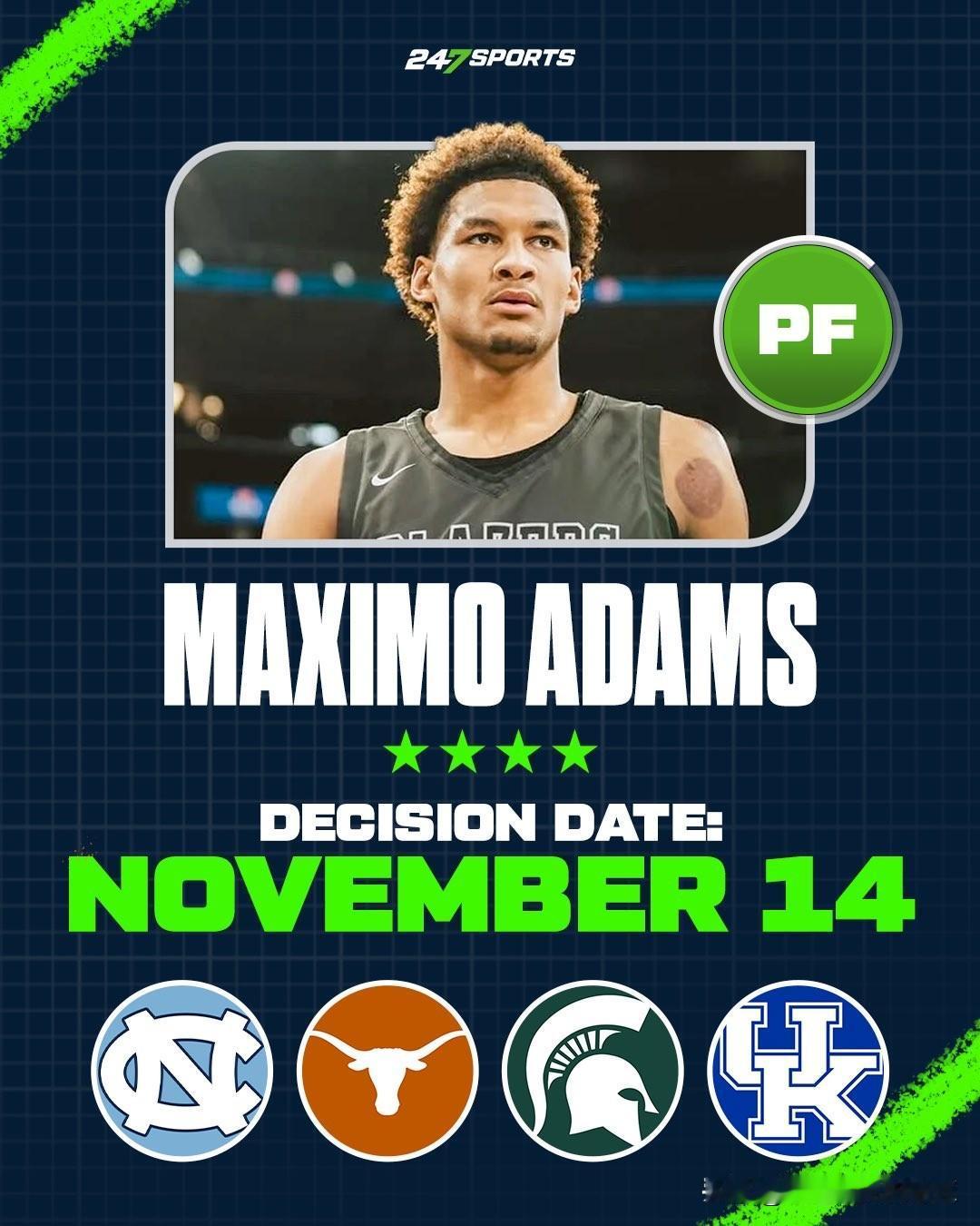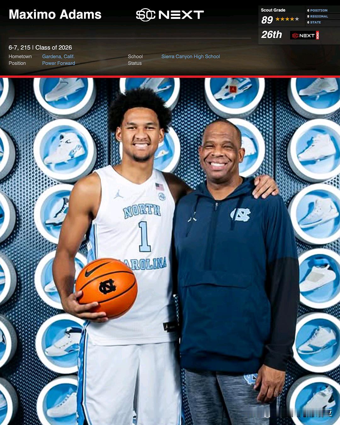 TOP30四星前锋Maximo Adams宣布承诺NCAA男篮 北卡大学,拥有意大利和阿根廷的血统,身高6-7=201,高中就读于加州塞拉峡谷Sierra Canyon,球队的文化、传统和荣誉对他来说很重要,另外北卡的粉丝也是首屈一指,主帅Hubert Davis在招募过程中与他建立了非常好的关系。